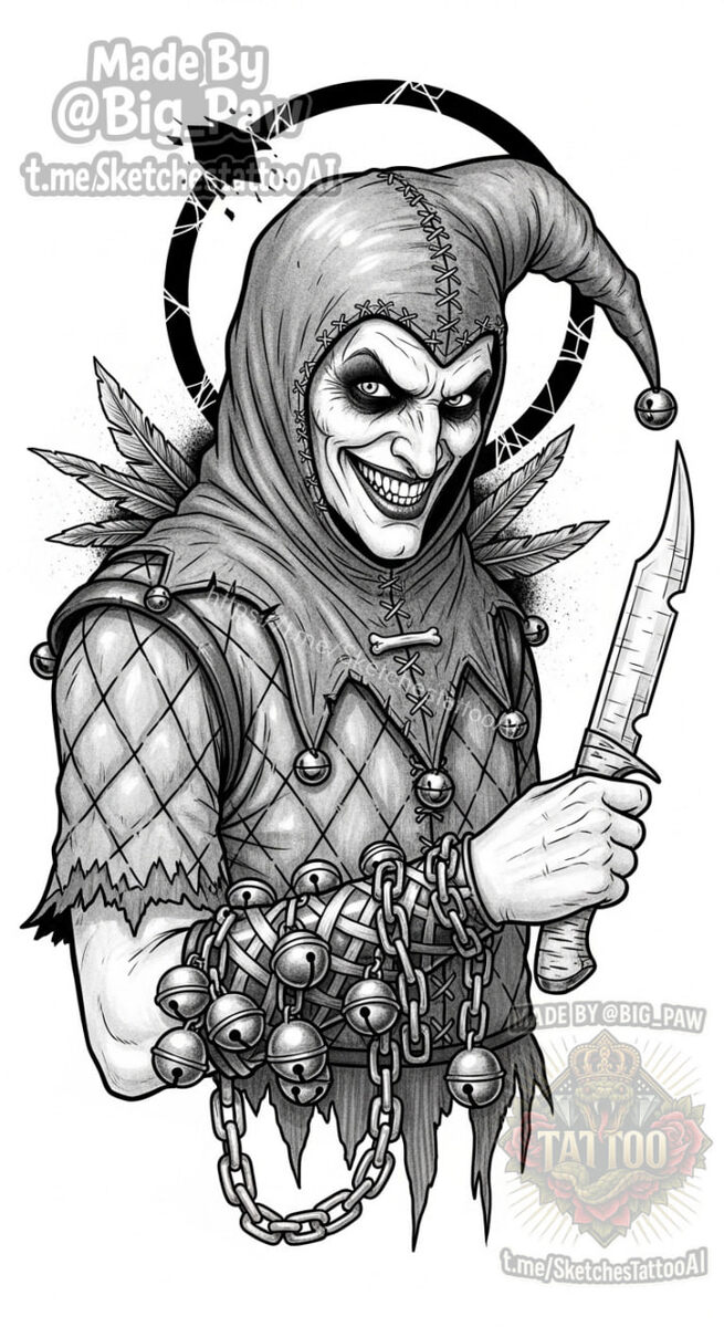 #2766 Подборка по запросу подписчика - сделать эскиз шута маньяка. Главное что бы не в стиле группы король и шут. Шут как персонаж. По пояс или по плечи. 🧠 SYNTX - создай свой эскиз 💎 Информация - все услуги 💀 Эскизы от нейросети #шут #скомарох #реализм #эскиз #тату #татуировка