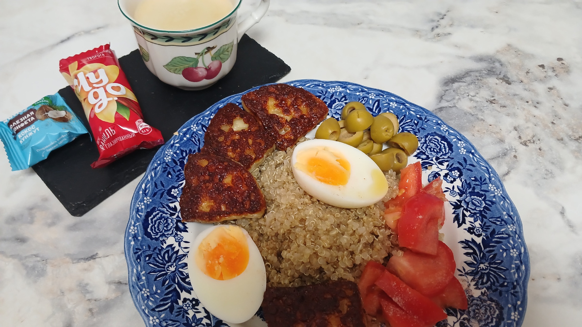 Завтракаем боулом с киноа, вареным яйцом, овощами и сыром халуми.