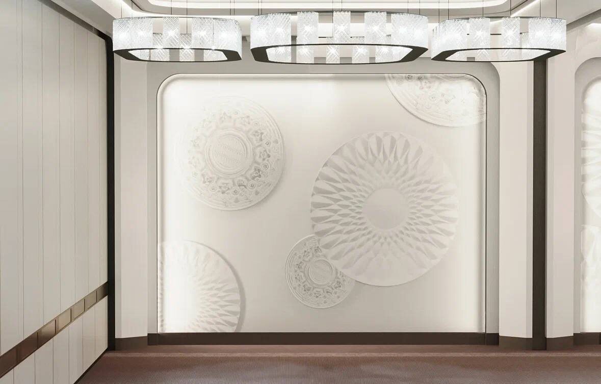 Авторский надзор в деталях. Вдохновляясь идеями, мы не только создаём, но и внимательно следим за их воплощением. Сегодня делимся визуализациями будущего банкетного зала в гостинице «Россия», сейчас находящегося в стадии реализации. Особое внимание уделено гипсовым орнаментам в форме кругов — их форма и текстура делают их по-настоящему необычными. На первых трёх фотографиях — как эти элементы будут выглядеть после завершения отделочных работ, а на четвертом-восьмом фото — их текущий облик и процесс отделки. Круги займут место на стенах, и их выразительная форма обязательно привлечёт внимание гостей! Понравились ли вам эти акцентные орнаменты на стенах? #проектЕК #lifestyleEK