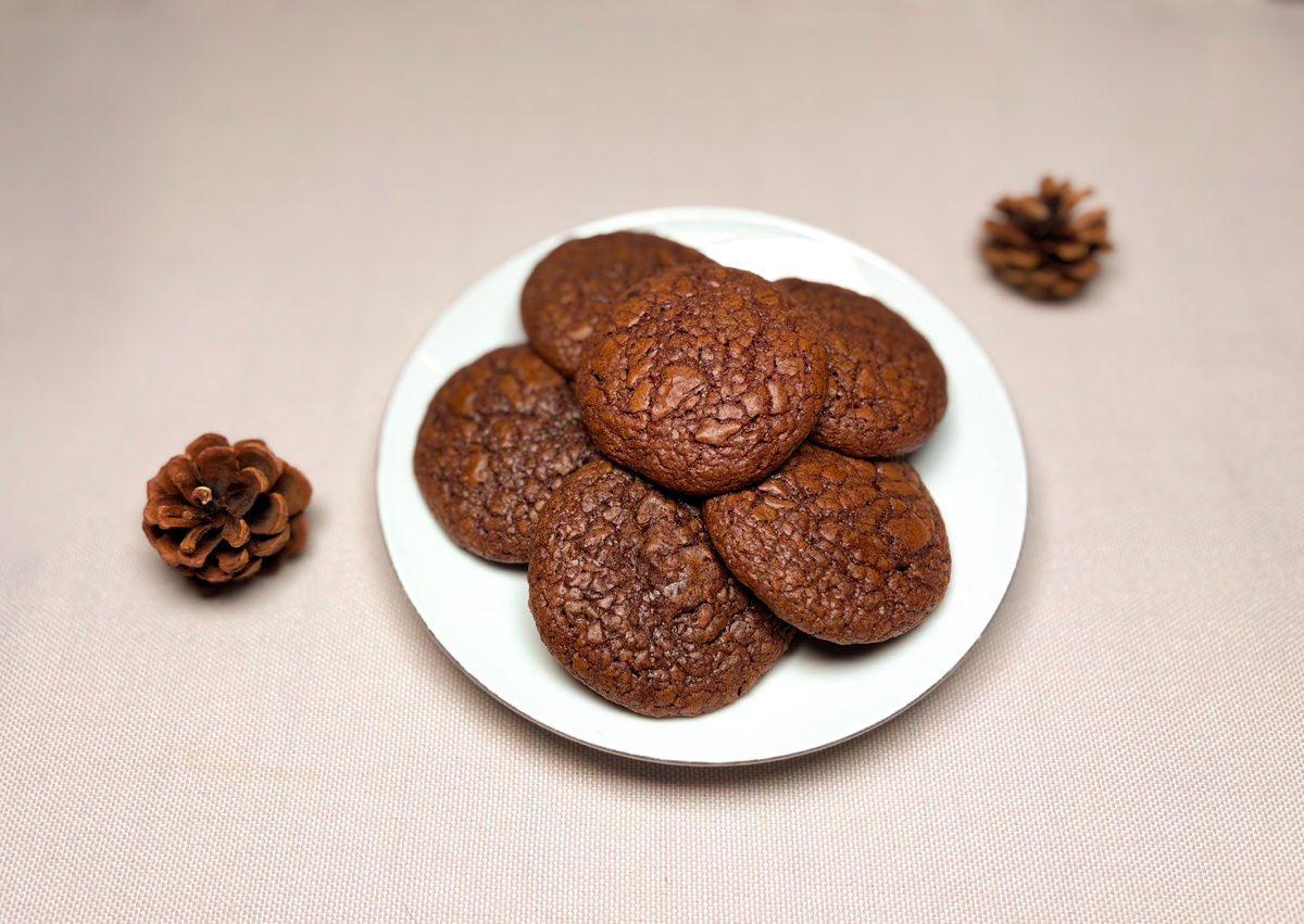Ингредиенты (на 6 штук): Приготовление: Шоколад ломаем и растапливаем импульсами вместе со сливочным маслом. Перемешиваем и оставляем остужаться. Сахар и яйцо взбиваем до светлой пены. Шоколадную массу постепенно добавляем к яичной смеси при помощи силиконовой лопатки. Далее всыпаем сухие ингредиенты. Перемешиваем до однородности. Масса должна остаться жидкой. Убираем в холодильник на пол часа или час. Формируем шарики, одинаковые по весу. Выкладываем их на застеленным пергаментом противень на большом расстоянии друг от друга. Выпекаем 13 минут при 180°C. После этого ждём полного их остывания. Все, вы молодцы, приятного аппетита!