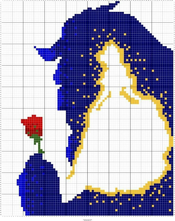 Для представленной ниже схемы понадобятся оттенки желтого для образа Белль, оттенки синего, переходящего в фиолетовый, для образа Чудовища. Оттенки красного и зеленого нужны будут для вязания силуэта розы.