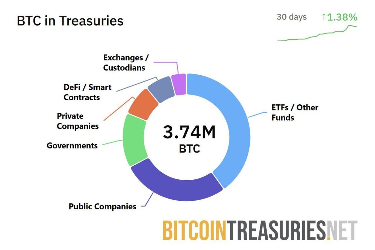 🚨 BIG NEWS: Bitcoin treasuries are sitting on a whopping 3.74M $BTC! 😲 That’s nearly 18% of the total supply