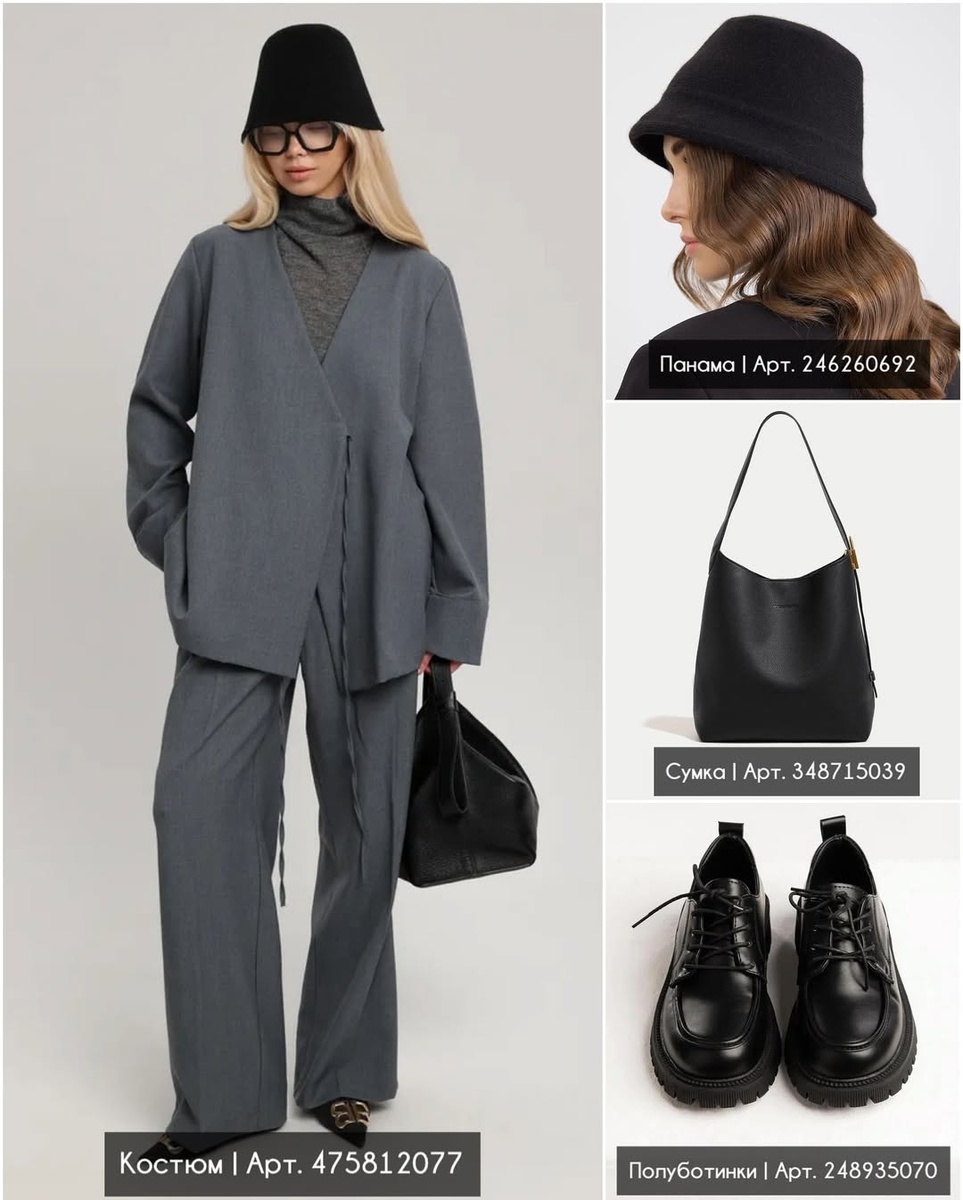 В этой подборке — четыре готовых комплекта, собранных в спокойной нейтральной палитре: графит, сливки, светлый лимон, благородный шоколад. Такие вещи легко комбинируются и выглядят дороже своей цены. Ниже — строго по порядку и с артикулами — разбираю каждую находку с детальным описанием и практическим советом стилиста.