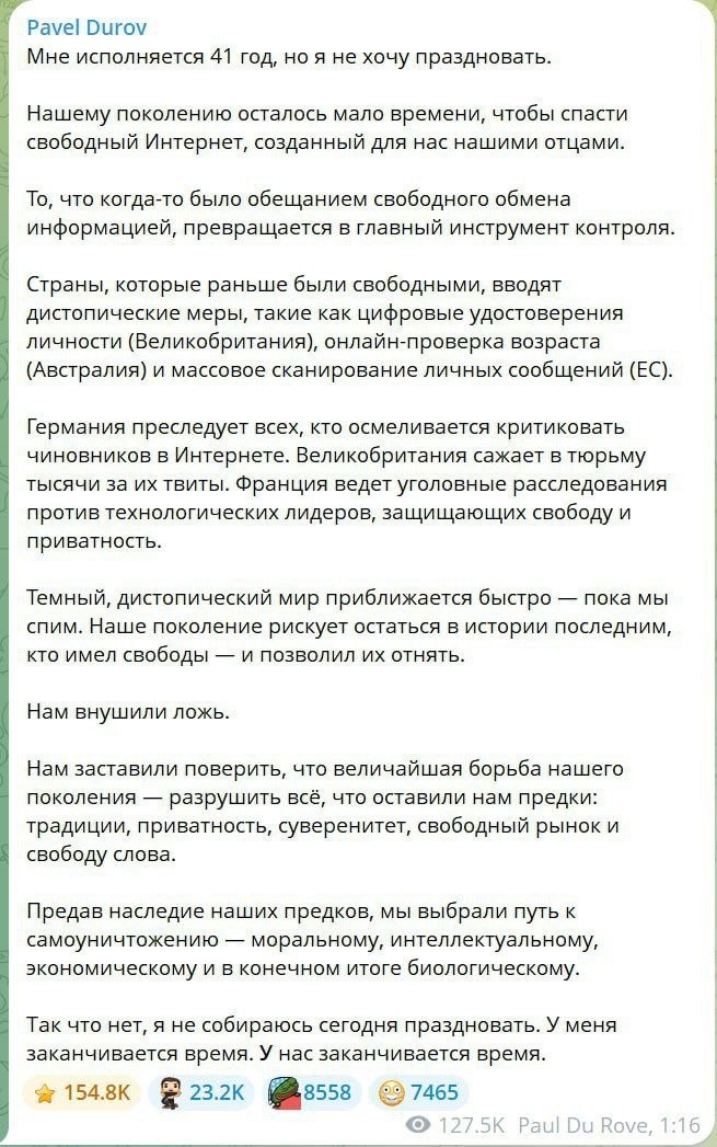 «Свободный интернет на грани исчезновения» Павел Дуров в день своего рождения опубликовал мрачный пост о тотальной слежке государств за гражданами и предстоящем ограничении свобод. Он подчеркнул, что общество было обмануто и вынуждено разрушить наследие предков, традиции и право на частную жизнь. Дуров считает, что нынешнее поколение рискует стать последним, кто знал настоящую свободу, и позволило ее отнять. Он откажется от празднования своего дня рождения. ────────── ⚡️Важные новости – без лишнего шума!⚡️ Подпишись на канал и получай только суть: оперативно, чётко, по делу! 👉 ИнфоСплетник | @infospletnik