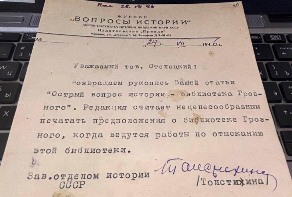 Возвращаем рукопись Вашей статьи «Острый вопрос истории – библиотека Грозного». Редакция считает нецелесообразным печатать предположение о библиотеке Грозного, когда ведутся работы по отысканию этой библиотеки».
