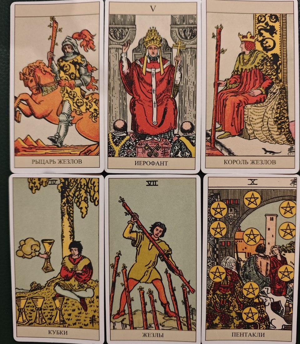Карты: Рыцарь Жезлов, Иерофант, Король Жезлов, 4 Кубков, 7 Жезлов, 10 Пентаклей.