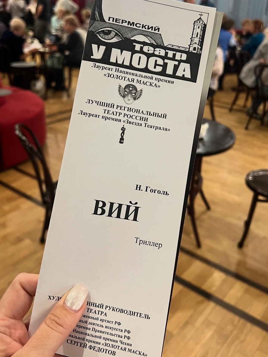 Спектакль «Вий» от Пермского театра «У Моста» я хотела посмотреть давно и вот моя мечта сбылась!!! Я зашла в зрительный зал и погрузилась в атмосферу хутора, ещё не видя икон на заднике, ощутила запах ладана…. А, когда Хома зажигал свечи (не настоящие, конечно), по воздуху потёк запах спичек… Из таких, казалось бы «мелочей» создаётся кружево постановки. Стопроцентное погружение в материал… Сейчас будет шок!!! «Вия» репетировали в заброшенной церкви!!! Ночью!!!! На кладбище!!!! Ууууууууууууууууууу….. Только так, по мнению главного режиссера театра, достигается успех у зрителей с безоговорочным аншлагом! Классическая классика, мистическая мистика от Федотова по Гоголю. Ни слова от себя! Никакого постмодернизма! Поэтому пересказывать сюжет не имеет смысла). Всё точно как в «Миргороде»! Игры актёров не видно - они живут на сцене! Просто из начала 19-го века к нам на сцену «Театра на Страстном» телепортировали настоящих казаков (Владимир Ильин, Илья Бабошин, Виталий Швец) и бу