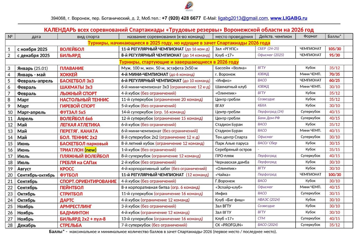 Программа Спартакиады Воронежских «Трудовых резервов»-2026 В сезоне-2026 Воронежское региональное отделение «Трудовых резервов» проведет 28 коротких и длительных корпоративных турнира по 22 массовым видам спорта (11 из них – при поддержке министерства физической культуры и спорта Воронежской области). Соревнования пройдут в рамках коротких (однодневных) турниров, мини-чемпионатов и – регулярных длительных чемпионатов. Многомесячных чемпионатов будет, по традиции, 5 (пять) – по ФУТБОЛУ, БАСКЕТБОЛУ, ВОЛЕЙБОЛУ, БИЛЬЯРДУ и ХОККЕЮ. Также будут проведены привычные уже короткие турниры по ПЛАВАНИЮ, ШАХМАТАМ, КРОССУ, ЛЕГКОЙ АТЛЕТИКЕ, ПЕРЕТЯГИВАНИЮ КАНАТА, НАСТОЛЬНОМУ и БОЛЬШОМУ ТЕННИСУ, ЛЫЖНОМУ и ГИРЕВОМУ СПОРТУ, КРОССУ и СПОРТИВНОМУ ОРИЕНТИРОВАНИЮ, ПЕЙНТБОЛУ, ДАРТСУ, БАДМИНТОНУ, АРМРЕСТЛИНГУ, ГРЕБЛЕ и СТРЕЛЬБЕ. И в новом сезоне дебютирует ТРИАТЛОН (плавание на 750 м + велогонка на 20 км + бег на 5 км) По итогам сезона определится Лучшая спортивная организация региона. Участие в каждом турнир