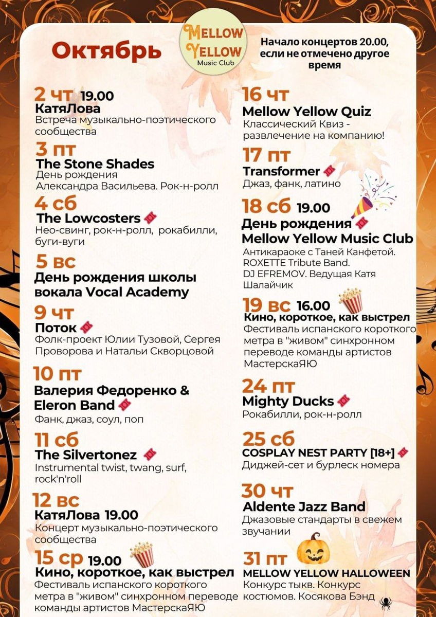 Всем привет. Сегодня 1-е октября, хороший повод представить нашу октябрьскую афишу. Как всегда, есть разные новинки. Например, русский фолк-джаз от трио "Поток" с участием Юлии Тузовой, Сергея Проворова и Натальи Скворцовой. Джаз и соул от Валерии Федоренко. Валерия - выпускница Академии джаза И. Бутмана, солистка Jazz Academy Big Band п/у Дениса Мельникова, победительница международных джазовых конкурсов, но это не главное. Будет большой состав с барабанами, гитарами, клавишами, дудками, бэками. Это всегда интересно. Также к нам заходит новый киноклуб. Начнем с мини-феста современных испанских короткометражек. Будет живой синхронный перевод, что вообще очень круто. Кроме новинок есть традиционный набор - джаз, рок-н-ролл, танцы, квиз... Не обошлось и без бурлеска. Да, 18-го мы празднуем 🎊День Рождения🎉! Но об этом отдельно и немного позже. 🎸Mellow Yellow music club🎷 📍Нагатинская ул, 16с9 ТЦ Конфетти, проход через арку. ⏰ Работаем для вас каждый день с 19 до 5 утра. 📆Афиша и