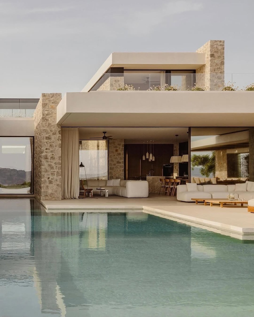 Эта вилла — манифест спокойной роскоши: монолитные плиты, крупные раздвижные стеклянные плоскости, натуральный камень и мягкая мебель в молочных тонах. Дом будто растворён в пейзаже: линии горизонталей перекликаются с линией гор и горизонтом моря, а вода бассейна отражает свет как вторая небо.