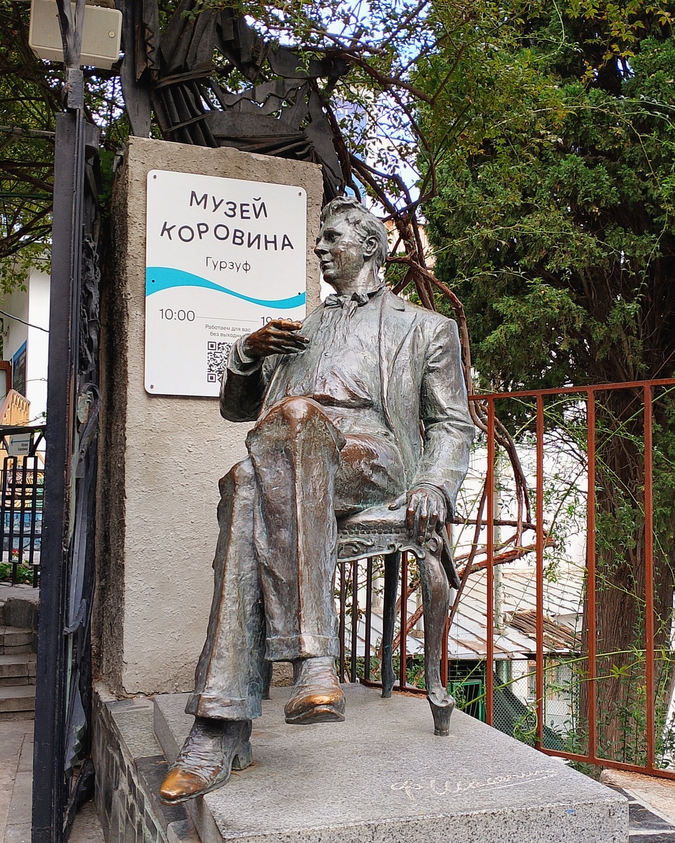 Здесь же у входа в музей разместилась бронзовая фигура Федора Ивановича, позирующего художнику и другу Константину Коровину.