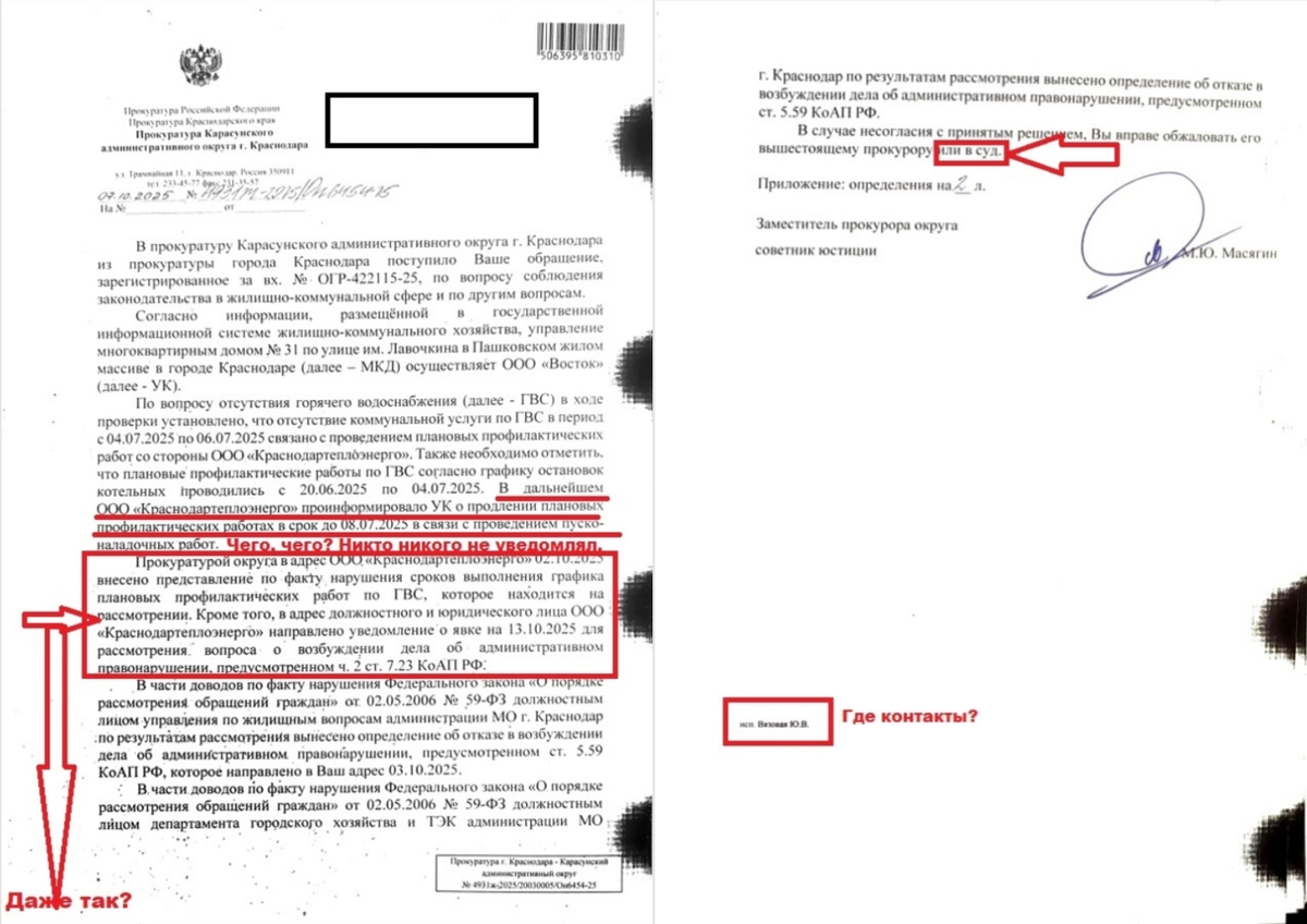 Документы есть, а правды нет: почему прокуратура игнорирует факты. Подача обращения в органы прокуратуры от 09 октября 2025 № 6238232609. Действия. Заявление отправлено в ведомство. Сегодня в 23:32 В Генеральную прокуратуру Российской Федерации Куда: 125993, г. Москва, ул. Большая Дмитровка, д. 15а ЖАЛОБА на незаконные действия заместителя прокурора Карасунского административного округа г. Краснодара Масягина М.Ю. и системные нарушения законодательства при рассмотрении обращений Настоящим обращением выражаю крайнее возмущение бездействием и незаконными действиями органов прокуратуры Краснодарского края при рассмотрении моих обращений. 09.10.2025 мною получен ответ от заместителя прокурора Карасунского административного округа г. Краснодара Масягина М.Ю. за №Н931ж-2075/Оп6454-25, который содержит следующие грубейшие нарушения: 1. Заведомо ложные сведения и фальсификация проверки: В ответе утверждается, что ООО «Краснодартеплоэнерго» проинформировало УК о продлении плановых профилактичес