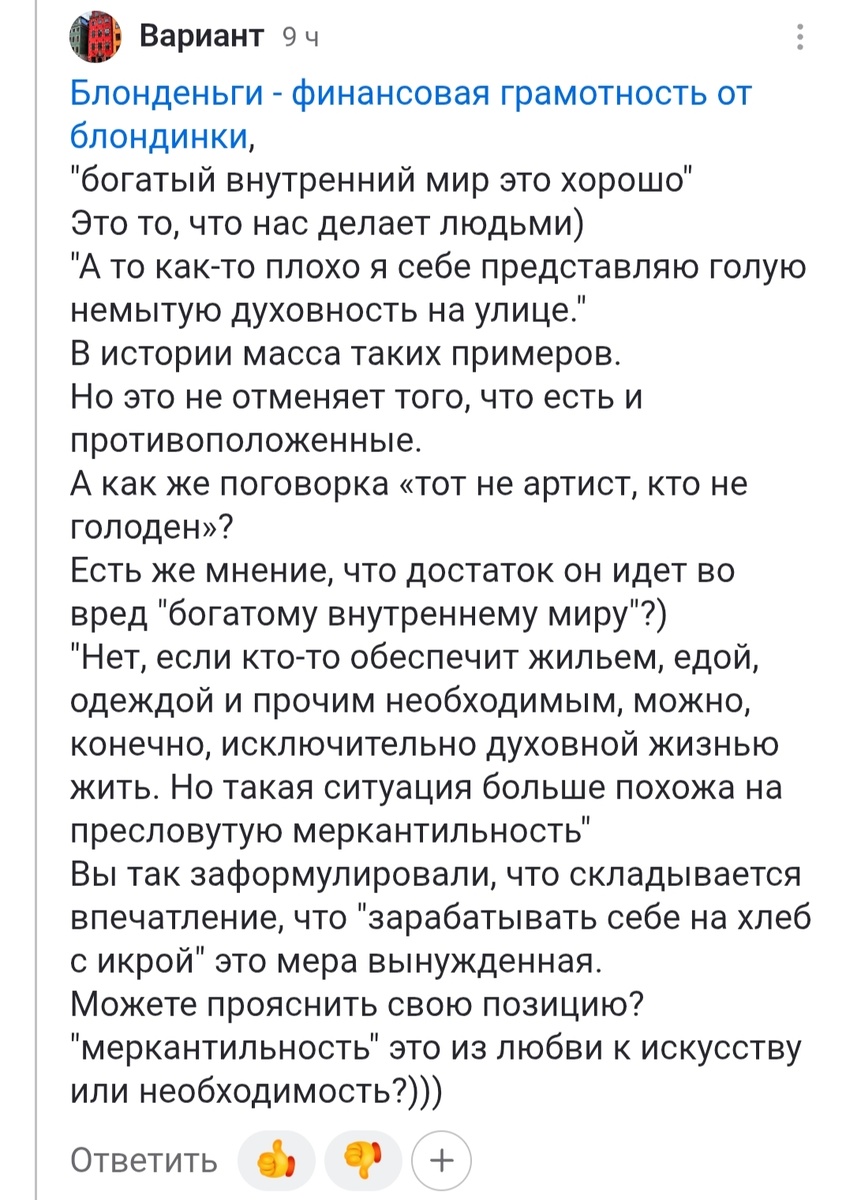 Этому каналу не хватало с...ча, простите, оживленных споров в комментах, без вариантов. Вариант появился, а с ним - кхм... Диспуты. Кратко: он поинтересовался, правда ли, что здесь собрались самые меркантильные женщины Дзена, а потом вежливо дискутировал со мной на тему "тот не артист, кто не голоден", и спрашивал, меркантильность это из любви к искусству или необходимость? Товарищи, вы знаете примеры голых немытых высокодуховных людей, живущих на улице? Только подтвержденные, а не из житий святых, где слепые прозревали, хлебы умножались, а источники воды внезапно прямо в полу появлялись. В голову приходит, пожалуй, Диоген Синопский, живший в бочке. В Греции-то можно и в бочке пожить, там минусовой температуры почти не бывает. Каким образом Диоген пережил бы в бочке российскую зиму - не представляю. Да и если присмотреться, за нищими творцами всегда кто-то стоял или не такими уж нищими они были. Кто у нас "из бедных"? Ломоносов? Он из крестьянской семьи, но зажиточной. В бедной бы даже