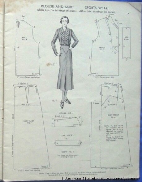 Ещё один пример выкройки юбки 1930х годов со швом спереди и встречной складкой по части длины. Здесь добавлена фигурная баска по переднему полотнищу юбки. Блузка кажется простой, но интересной. Я бы добавила хотя бы полуприталивание. Подобные фасоны кажется нетрудными для стилизации. Юбки с небольшим расклешением или годе продаются в магазинах, они сейчас в моде. Другая иллюстрация - идея для лета. Платье для августовских вечеров. Интересует модель в горошек. Можно сделать складки или сборки в верхней части лифа. Складки спереди юбки дадут свободу и не будут акцентировать живот. Жаль, не указан год журнала и нет другой страницы. Перевод текста слева от читателя, от картинки. "Для мягких платьев на противоположной странице тяжёлый прозрачный креп - первая мысль. Для платьев на этой странице шёлковый креп, принтованный или однотонный. Но, чтобы платье завершило лето и начало осень. Принтованный атлас - новая вещь. В любом из этих пяти платьев Вы будете элегантной. Заметь