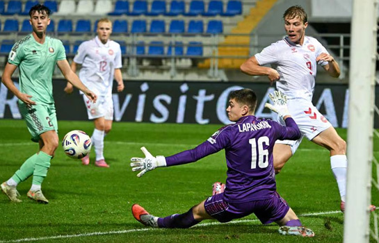 Беларусь и Дания сошлись на нейтральном поле в Венгрии. Скандинавы ожидаемо больше времени проводили в позиционном нападении и вскоре добились успеха. Кристенсен разыграл "стенку" с Дамсгором и отпасовал в центр на Фрохольдта, поразившего ворота. Чуть позже отличился набравший отличную форму Хейлунн, воспользовавшийся скидкой Фрохольдта во вратарскую. У подопечных Карлоса Алоса в атаке ничего не получалось. А в концовке тайма счёт и вовсе стал разгромным — Хейлунн оформил дубль. Форвард "Наполи" был первым на отскоке, когда Доргу зарядил в штангу. В добавленное время Хейлунн выступил в роли диспетчера, отдав на пустые ворота Доргу. После перерыва картина происходящего на поле не изменилась — Дания атаковала и могла забить ещё несколько мячей. Появившийся Эриксен дважды не попал в створ из хороших позиций. А вот Дрейер отличился спустя пару минут после выхода на замену, получив пас от Хегсберга, доставшего уходящий за лицевую мяч. Чуть позже Дрейер забил свой второй гол, воспользовавшись ошибками голкипера и защитников. В концовке датская команда претендовала на пенальти, но судья, изучив повтор, изменил своё первоначальное решение, а в добавленное время выручил Лапоухов, не позволив Эриксену себя перебросить.
