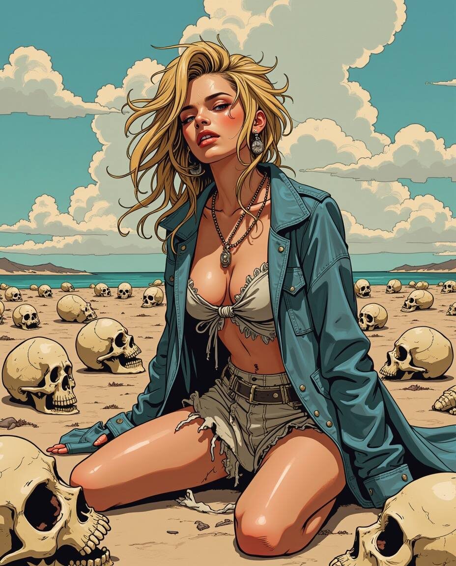 Изображенный в виде современного Робинзона Крузо, окруженного черепами и скелетами на этой иллюстрации. На изображении изображена преследую сцена поп-звезды в пустынной обстановке. Ее потрепанная одежда и дикие, неухоженные волосы добавляют атмосферу отчаяния и изоляции. Умелое использование художником цветов и оттенков создает ощущение глубины и атмосферы. Эта картина представляет собой потрясающее изображение антиутопической версии поп-иконы, плавно сочетающей миры фантазии и реальности. Промт: depicted as a modern-day Robinson Crusoe surrounded by skulls and skeletons in this illustration. The image portrays a haunting scene of the pop star in a desolate setting. Her tattered clothes and wild, unkempt hair add to the air of desperation and isolation. The artist's skillful use of colors and shading creates a sense of depth and atmosphere. This painting is a stunning depiction of a dystopian version of a pop icon, blending the worlds of fantasy and reality seamlessly.