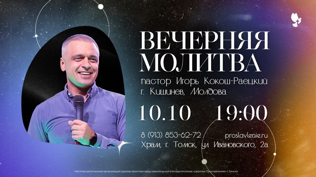 🤩УЖЕ СЕГОДНЯ СЛУЖЕНИЕ ИСЦЕЛЕНИЯ! В пятницу, 10 октября в 19:00 🤩г. Томск, ул. Ивановского, 2а На этом служении будет служить пастор Игорь Кокош-Раецкий (г.Кишинев, Молдова)🙏 🍂Не упустите момент Божьего прикосновения! Приходите сами и зовите друзей.