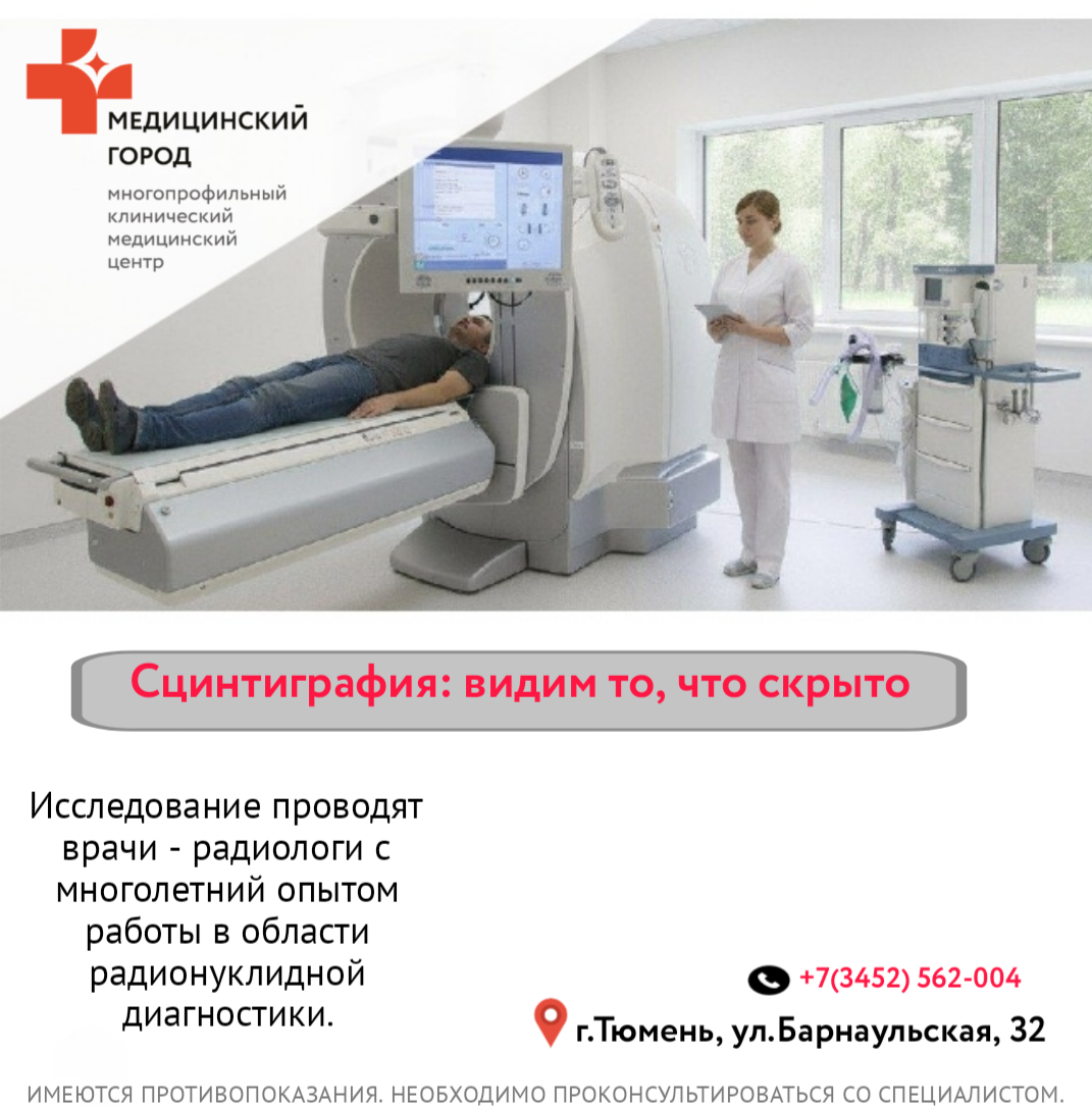Сцинтиграфия — это современное неинвазивное радионуклидное исследование, позволяющее оценить функциональное состояние органов и тканей. Метод основан на получении двухмерного изображения органа путем регистрации испускаемого излучения от радиофармацевтического препарата, который предварительно вводится в организм пациента. В отличие от других методов визуализации, сцинтиграфия показывает не только структуру, но и то, как именно работает орган. Исследование помогает диагностировать: Своевременная диагностика – шанс на здоровье и уверенность в завтрашнем дне. Сцинтиграфия: видим то, что скрыто. Бережём главное — ваше здоровье. Важно: сцинтиграфия проводится только по направлению и при наличии четких медицинских показаний, определенных вашим лечащим врачом. Об услугах , предоставляемых ГАУЗ ТО "МКМЦ "Медицинский город", вы можете узнать на нашем официальном сайте или по телефону: +7 (3452) 562-004 (единый колл-центр). Записаться на приём к врачу можно с помощью виртуального помощника.