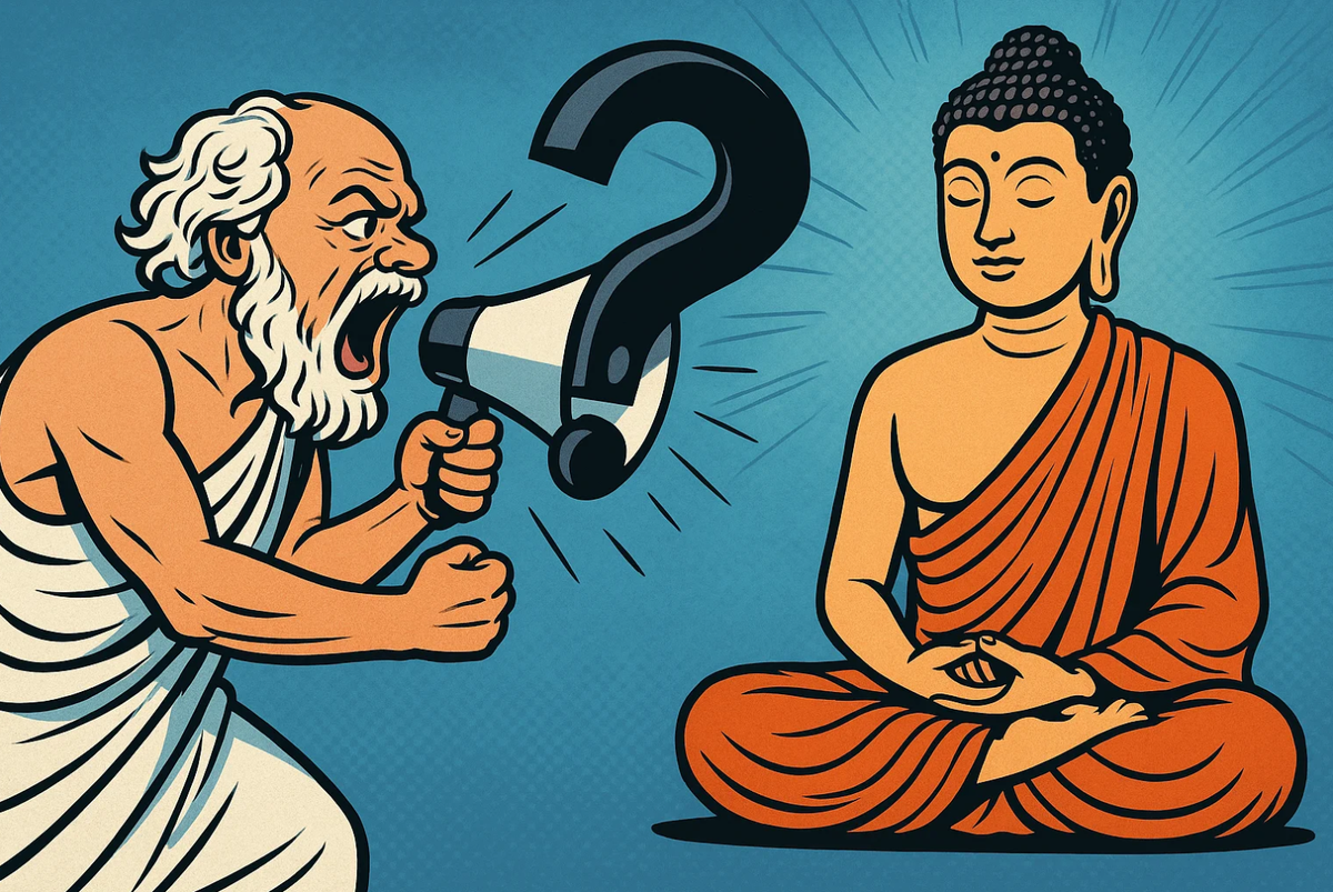Разбираем древние операционные системы для ума. Which one is better? Вы когда-нибудь чувствовали, что ваш внутренний диалог похож на ток-шоу, где два ведущих спорят без правил? 😵 Один вечно сомневается и задает неудобные вопросы. Другой молча наблюдает и предлагает просто дышать. Знакомо? Поздравляю, у вас внутри живут Сократ и Будда. Оба — гуру осознанности. Оба изменили мир. Но их методы — как огонь и вода. Кого же слушать? Давайте устроим честный баттл и узнаем! 🥊 СОКРАТ: Диалог до победного 🧘 БУДДА: Молчание, которое говорит все 🥊 СОКРАТ: Дознаться до сути