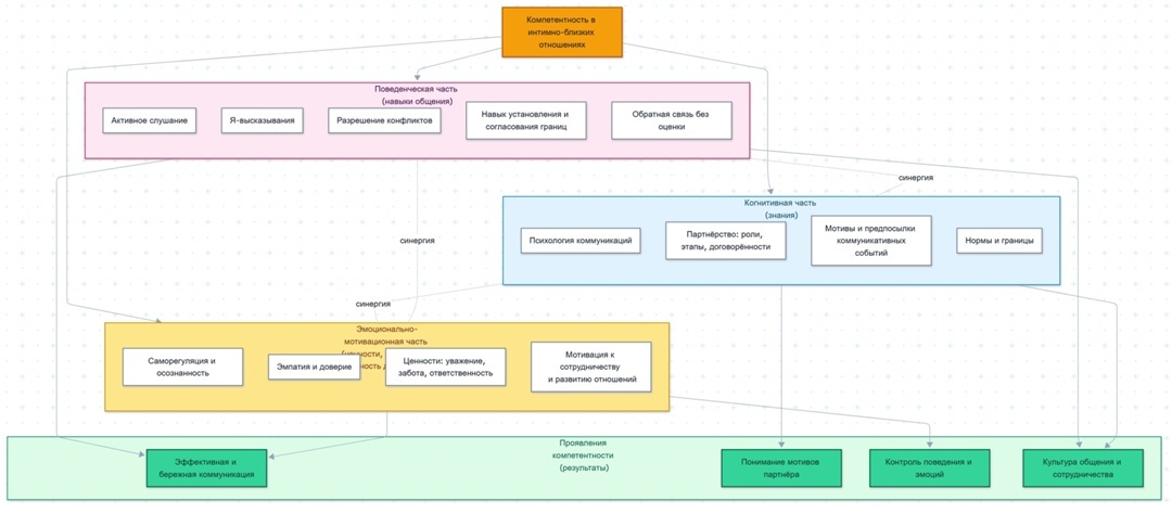 Компетентность человека в области интимно-близких отношений можно понимать как набор качеств, содержащих ряд навыков, умений и знаний дающих возможность эффективно коммуницировать с целевой группой людей, понимать мотивы и предпосылки коммуникативных событий при построении и развитии интимно-близких отношений. Компетентность можно разделить на 1) когнитивную часть (знания), 2) эмоционально-мотивационную часть (ценности, отношения, готовность действовать), 3) поведенческую часть (навыки общения). Компетентный в области интимно-близких отношений человек должен обладать достаточно важными знаниями об особенностях психологии коммуникаций и партнерства, контролирует свое поведение и эмоции, достаточно социализирован (может доверять, чувствовать эмоциональные состояния других людей, обладает достаточно необходимой для среды обитания культурой общения) при коммуникациях с целевой группой людей.