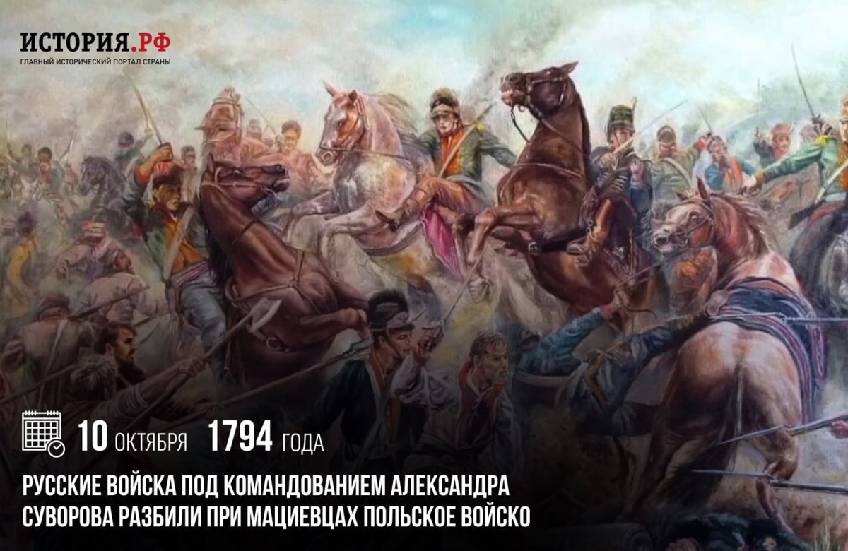 10 октября 1794 г. Русские войска под командованием Александра Суворова разбили при Мациевцах польское войско. Поражение под Мациевцами предопределило поражение всего «восстания Костюшко», которое успело распространиться по многим польским землям. Главные силы поляков были разбиты, а сам Костюшко взят в плен. Отступление повстанцев с поля боя переросло в бегство, но до Варшавы смогли добраться только 2 тысячи человек. Остальное польское войско было разбито, взято в плен или разбежалось. Стало очевидным, что дальнейшая борьба для поляков невозможна #ПамятныеДатыВоеннойИсторииОтечества #ДеньВИстории #ГодЗащитникаОтечества #80ЛетВеликойПобеды Источник: https://vk.ru/wall-216215303_2460 Подпишитесь на наши группы ВКонтакте, в Одноклассниках, в Телеграм - читайте, смотрите и комментируйте информационные материалы, предлагайте свои! Источник: Открыть