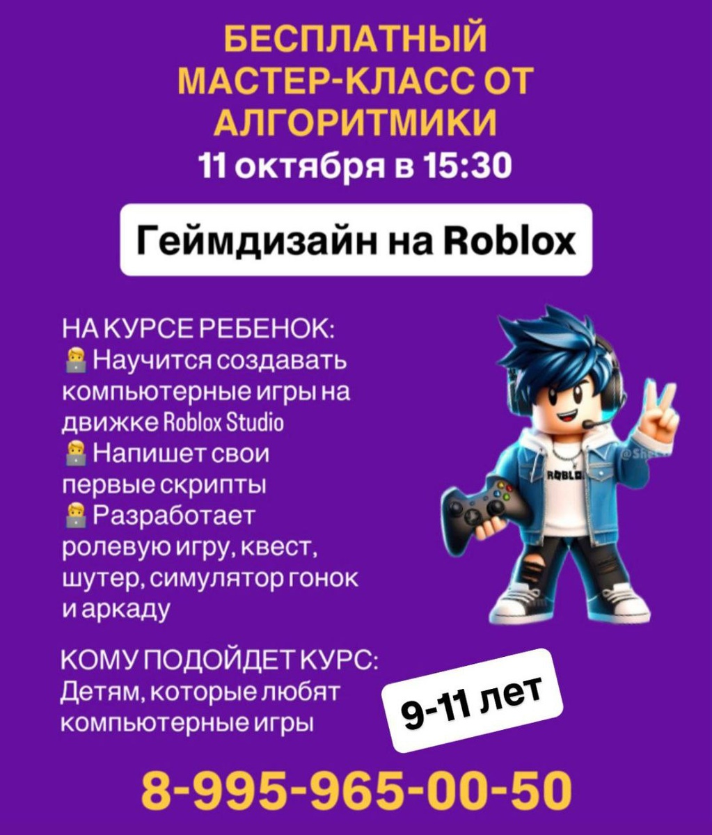 Международная школа программирования «Алгоритмика» приглашает детей 6-18 лет на самые интересные и полезные занятия по IT- направлениям🚀 1️⃣ Основы логики и программирования – 5-7 лет; 2️⃣ Компьютерная грамотность – 7-10 лет; 3️⃣ Визуальное программирование на Scratch– 9-11 лет; 4️⃣ Геймдизайн в Roblox – 10-11 лет; 5️⃣ Разработка игр на Unity – 12-14 лет; 6️⃣ Программирование на Python – 12-17 лет; Записаться на обучение или на бесплатный мастер-класс можно: 📱+79959650050 ✔️по телефону wa.me/+79959650050 ✔️ на сайте https://seversk.algoritmika.org/ru ✔️ в Вконтакте https://vk.com/algoritmika_seversk Мы находимся по адресу: г. Северск, ул. Калинина 42, БЦ «Время», каб 317.