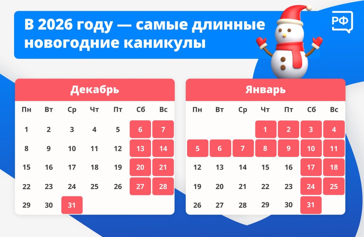 С 31 декабря 2025 года по 11 января 2026 года будут идти праздничные выходные. Как отметил глава Минтруда Антон Котяков, это будут самые длинные каникулы за много лет.