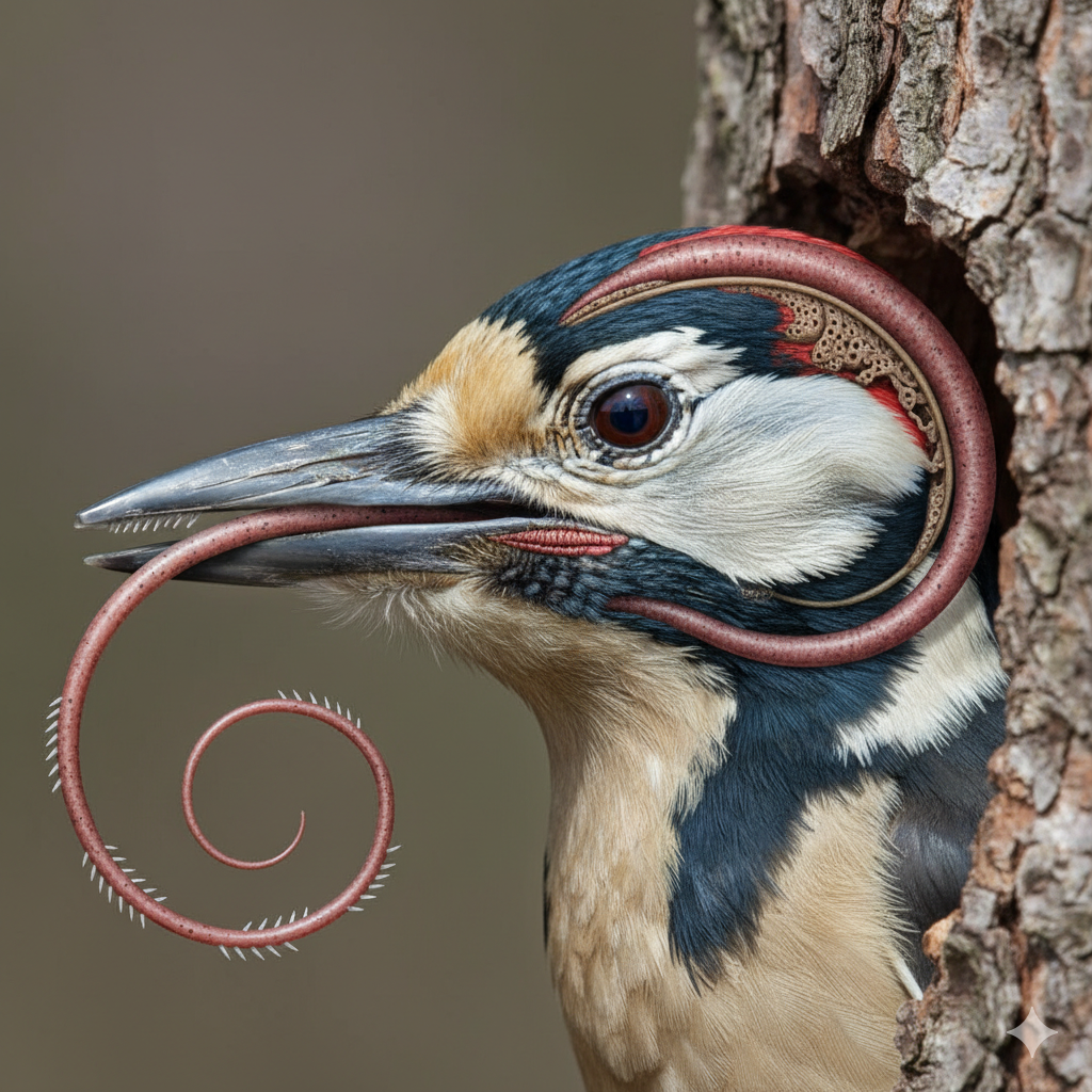Конечно, природа не создает ничего просто так. Столь необычное строение языка имеет вполне конкретную и жизненно важную цель. Дятел – настоящий лесной санитар. Своим мощным клювом он проделывает отверстия в коре и древесине, добираясь до ходов, где прячутся насекомые и их личинки. Но достать их из глубины извилистых тоннелей одним лишь клювом невозможно. И вот тут-то на сцену выходит его удивительный язык.
