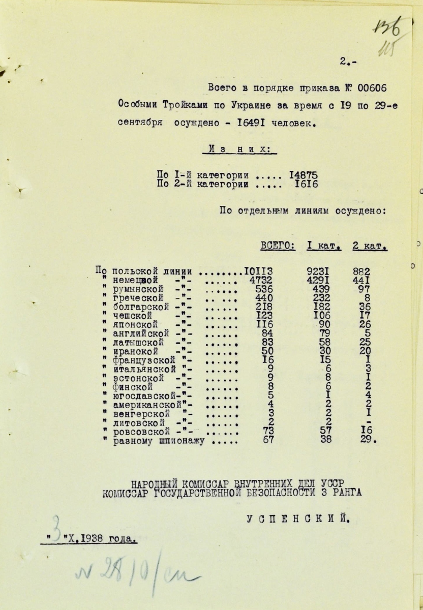 Согласно данным, приведенным в справке, подготовленной для Хрущева в 1956 году, в ходе польской операции было арестовано 143 810 человек, из них расстреляно 111 091. Это означает, что к высшей мере наказания приговаривались более 77% арестованных - показатель, превышающий даже общие цифры по национальным операциям. (Это при том, что польская военная разведка, известная как Второй отдел Генерального штаба Войска Польского (или «Двуйка»), насчитывала около 200 человек.)