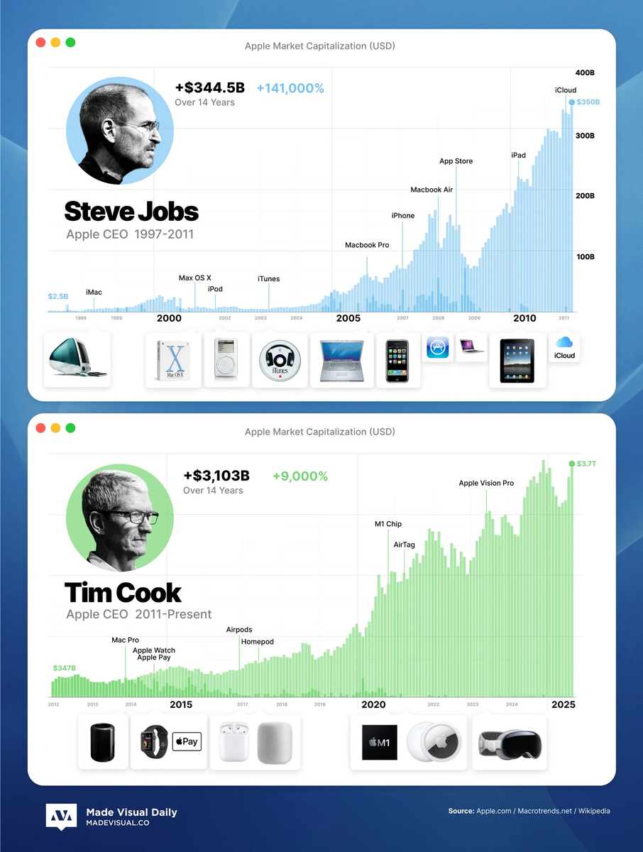 14 лет за плечами каждого. Траектория развития Apple под руководством двух лидеров в значительной степени отражала их индивидуальные черты: от радикальных инноваций любой ценой до зрелой, осторожной консолидации.