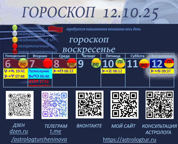 Первая половина дня обещает быть непростой: Луна образует несколько напряжённых аспектов, что может вызвать напряжение, недопонимание в отношениях и проблемы в делах, требующих чёткой концентрации и спокойствия. В таких условиях мы можем почувствовать, что наши чувства и желания сталкиваются с ограничениями и препятствиями — возможно давление со стороны, финансовые сложности или внешние обстоятельства. Обещания могут казаться сложными для выполнения, а попытки контролировать ситуацию — приводить к конфликтам. Стоит быть осторожными с финансами и деловыми инициативами. Лучше не форсировать события, не ввязываться в споры и избегать резких поступков. Вторая половина дня — более открытая и менее напряжённая. В это время появляется возможность для лёгкого и плодотворного общения. Мы можем встретить знакомого, с которым давно не общались, восстановить связи или решить важные вопросы. Появляется шанс наладить отношения и договориться о совместных планах. Однако нужно помнить о продолжающем д