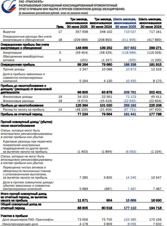 📊 Транснефть. Отчет МСФО за 1 полугодие 2025 г. ✔️Чистая прибыль = 153,4 млрд руб. или 212 руб на акцию (-10% к прошлому году). Основные перемены: финансовые доходы выросли на 26,7 млрд руб (+59%), а расходы по налогу на прибыль предсказуемо увеличились на 50,3 млрд руб (+106%). ✔️Выручка и EBITDA практически неизменны. ✔️Поквартальная динамика прибыли показывает, что взлет ставки налога на прибыль с 20 до 40% в 2025 году пока к катастрофе компанию не привел. ✔️Капитал = 2,95 трлн руб или 4076 руб на акцию. ✔️Чистый долг = минус 263,6 млрд руб. ✔️Процентные доходы от кубышки 542 млрд руб = 58 млрд руб (+64% к прошлому году), что составляет 38% чистой прибыли. После выплаты дивидендов в июле кубышка усохла на 143,7 млрд руб. ❗️Летом 2025 г. компания утвердила масштабную программу технического перевооружения и расширени