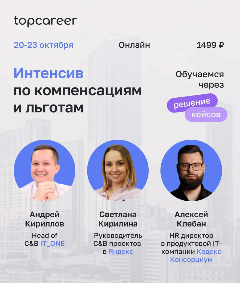 Хотите сделать систему вознаграждений преимуществом компании? Мы научим как! За 4 дня (с 20 по 23 октября) вы разберете ключевые задачи в политике вознаграждения в компании, получите обратную связь от экспертов и поучаствуете в розыгрыше доступа к флагманскому курсу! ▶️ ЧТО ВАМ ДАСТ УЧАСТИЕ В ИНТЕНСИВЕ? ✅ Отработаете стратегию вознаграждения и научитесь рассчитывать Salary Zone так, чтобы стейкхолдеры видели в ней бизнес-логику. ✅ Будете практиковаться в применении грейдов, чтобы система стала понятной, устойчивой и реально помогала управлять мотивацией. ✅ На основе анализа рынка вы построите стратегию найма и удержания, которая позволит компании оставаться привлекательной без «гонки зарплат». ▶️ КТО БУДЕТ ГОТОВИТЬ КЕЙСЫ И ОТВЕЧАТЬ НА ВОПРОСЫ? ✨ Андрей Кириллов, Head of C&B IT_ONE ✨ Светлана Кирилина, Руководитель C&B проектов в Яндекс ✨ Алексей Клебан, HR директор в продуктовой IT-компании Кодекс Консорциум ▶️ КАК ПРОХОДИТ ИНТЕНСИВ? 🧎♀️ Решаем кейсы: 20, 21 и 22 октября в лич