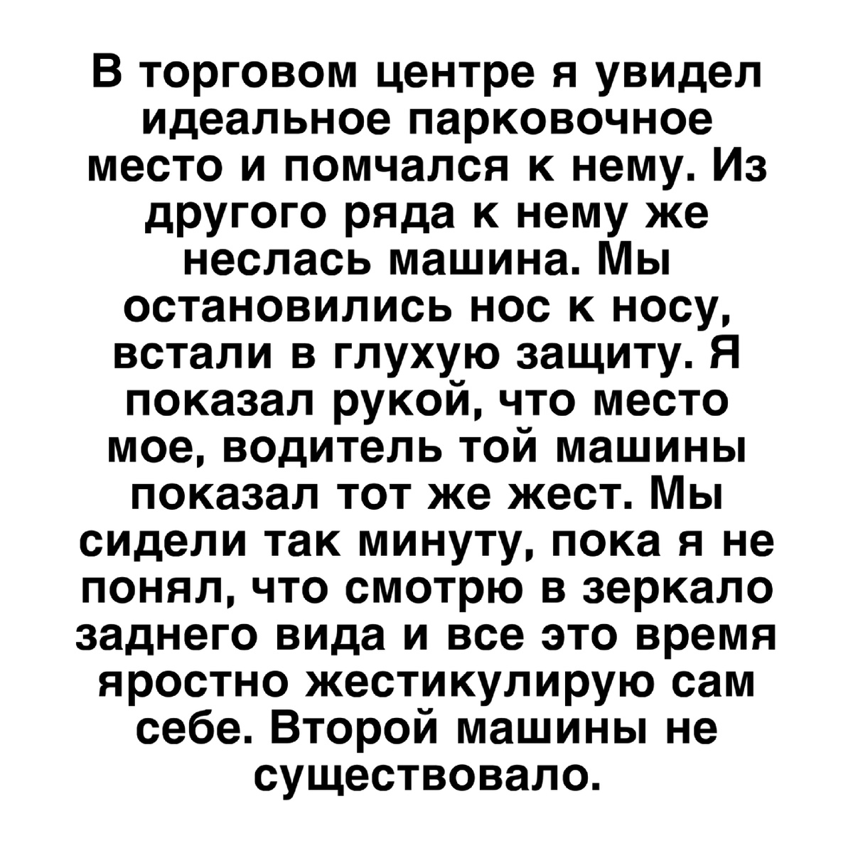 В торговом центре я увидел идеальное парковочное место и помчался к нему. Из другого ряда к нему же неслась машина. Мы остановились нос к носу, встали в глухую защиту. Я показал рукой, что место мое, водитель той машины показал тот же жест. Мы сидели так минуту, пока я не понял, что смотрю в зеркало заднего вида и все это время яростно жестикулирую сам себе. Второй машины не существовало.