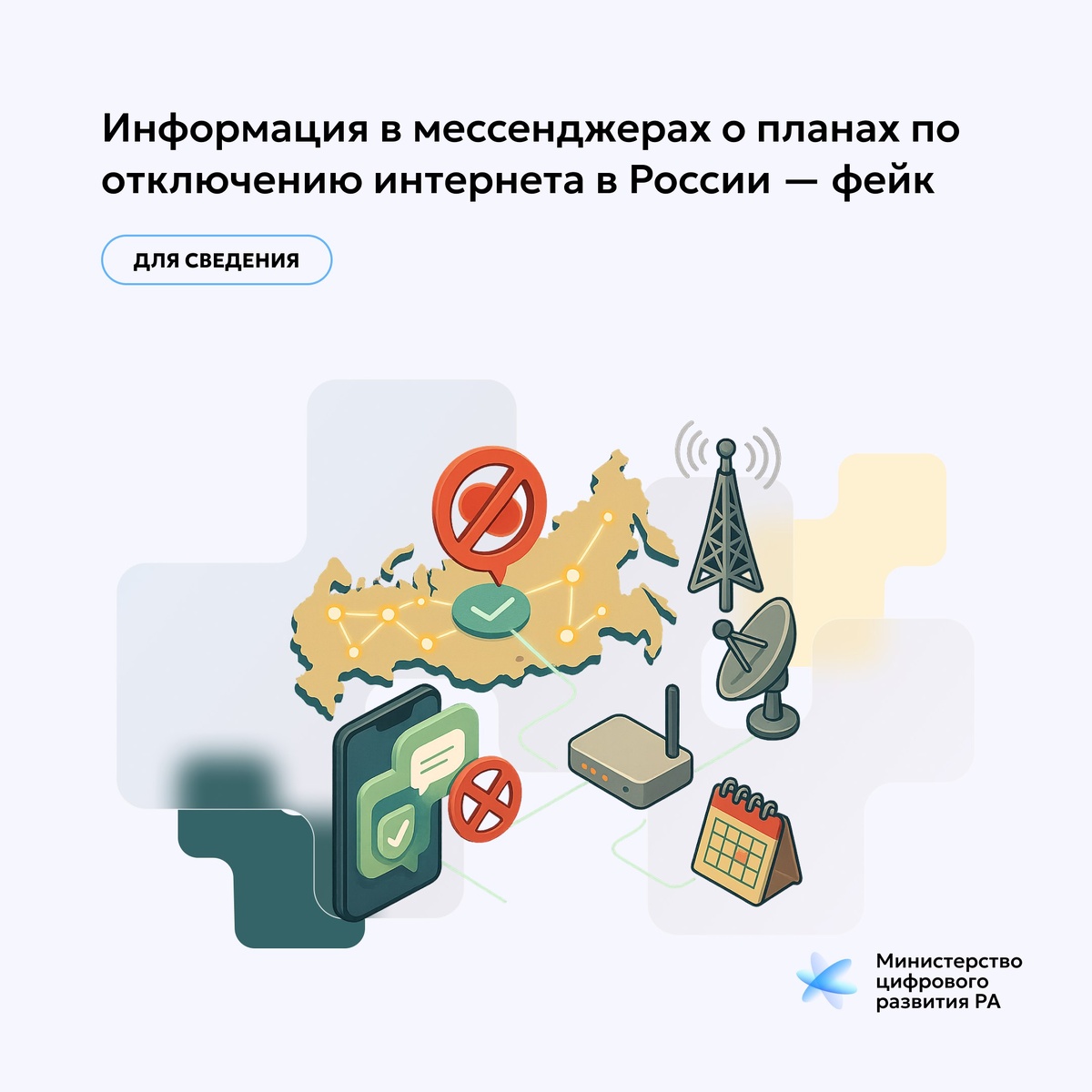 🔹В мессенджерах распространяются сообщения о возможном отключении интернета в России. Минцифры России опровергла эту информацию. 🔹В ведомстве подчеркнули, что фиксированный, мобильный и спутниковый интернет работают в штатном режиме, а планов по ограничению доступа нет. 🔹Гражданам рекомендуют проверять новости только в официальных источниках — на сайте Минцифры России и в её каналах в MAX и Telegram.