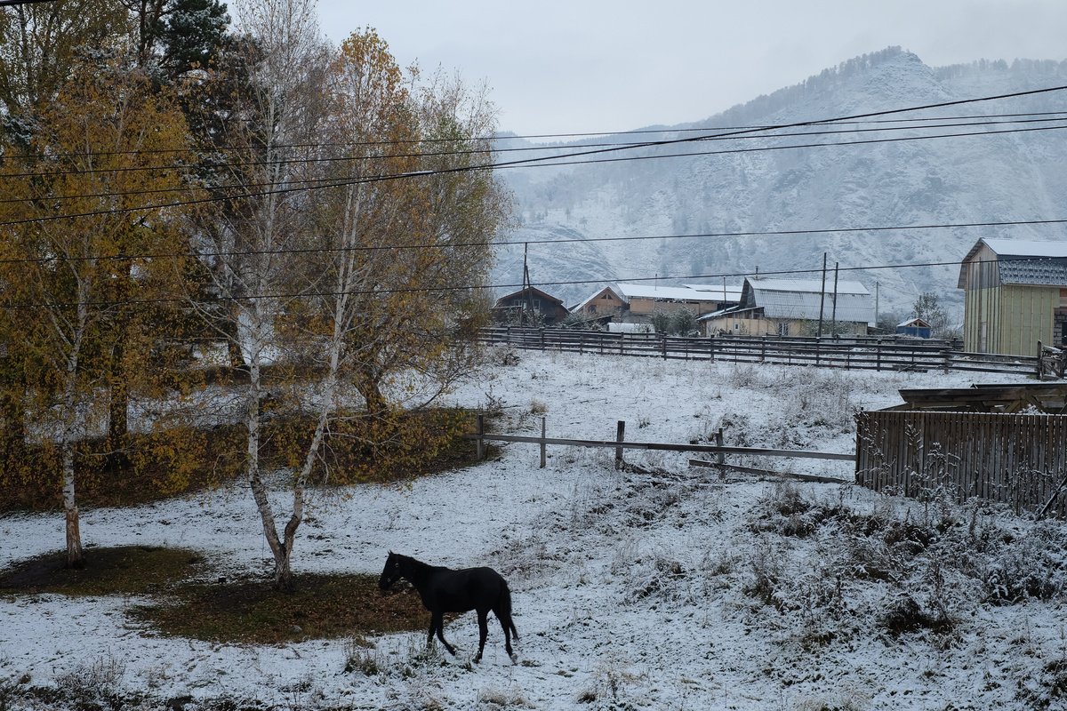 Казалось, за 16 дней пути мы увидели все оттенки погоды. Но Алтай снова удивил! Открыв утром глаза, мы увидели за окном настоящую магию: казалось прямо с гор тихо падал крупный, новогодний снег. Не метель, а именно сказочные хлопья снега. Заснеженные вершины, лес, дымка. Тишина! За этим представление можно было наблюдать бесконечно. Вы только посмотрите на эти припудренные поля. Пока я наслаждалась видом, Саша, не теряя надежды, отправился «к ней» – на свидание с Катунью, которой вчера подарил сережку (блесну). Кто не читал про рыбное фиаско день 16 – наверстывайте! Я ненадолго присоединилась понаблюдать за процессом и утренней рекой, но рыба сегодня была непоколебима. Ни единой поклевки. Но виды! Вершины припорошенные снегом, звук воды – природа завораживала! Не солоно хлебавши, по наводке нашей подписчицы мы поехали смотреть на «Сердце Дракона». Некоторые называют его и "Яйцо Дракона". Солнце уже вовсю светило, и от утренней зимы не осталось и следа. Алтай сменил декорации всего