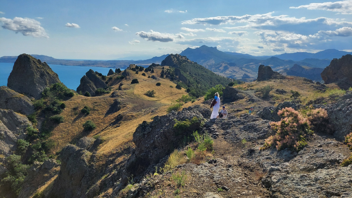 Двинули из Щелкино в сторону Коктебеля, там вулкан Карадаг и Карадагский заповедник. Планировали провести целый день в трекинге, ехать до туда два с половиной часа. Условно короткий маршрут это дойти до Чертова пальца и вернуться назад, но мы не знали, что это невозможно вне группы. Группу пришлось ждать 1.5 часа. Важный момент, ребят, узнавайте во сколько группы идут, потому что в день когда мы приехали, всего одна - в 15:30. Нам посчастливилось приехать в нужное время, мы не знали во сколько она пойдет, да и то, что нам придется идти с ними. Дальше, когда сезон уже будет в разгаре, запустят две группы в день. Одна в восемь с чем-то утра, а другая вот в это же время. Взрослые билеты 800 рублей, детские 500. В стоимость входит посещение музея. Мы зашли, чтобы скоротать время. Треккинг рассчитан на 4 часа. Три до Чертова пальца и один по короткой дороге назад. Мы шли самые последние, как и планировали, из-за того, что у меня есть ограничения здоровья, не позволяющие мне вообще заниматьс