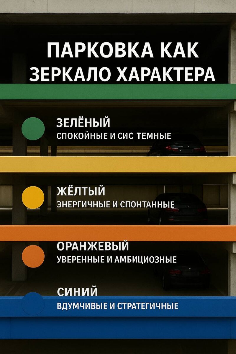 🚘 Парковка как зеркало характера Четыре цвета. Четыре этажа. Четыре типа людей. Каждый выбирает свой ритм — и свой уровень. 🟢 ЗЕЛЁНЫЙ — спокойные и системные Выбирают стабильность и порядок. Приходят чуть раньше, чтобы без суеты занять своё место. Доверяют логике и рутине — в этом их сила. 🧘♀️ «Главное — спокойствие, даже если парковка полная.» 🟡 ЖЁЛТЫЙ — энергичные и спонтанные Паркуются быстро, на вдохновении. Всегда в движении, вечно между делами и идеями. Для них утро — не начало, а продолжение драйва. ⚡ «Жизнь — это движение, а не разметка.» 🔵 СИНИЙ — вдумчивые и стратегичные Выбирают не первый доступный вариант, а правильный. Всегда анализируют, планируют, держат курс. Синий — это про внутреннюю глубину и холодную уверенность. 🌊 «Не спеши — просто паркуйся точно.» 🟠 ОРАНЖЕВЫЙ — уверенные и амбициозные Сильные, целеустремлённые, видят место даже там, где его нет. Им важно быть первыми, но не ради победы — ради процесса. 🔥 «Парковка — это тоже маленькое поле для побед.