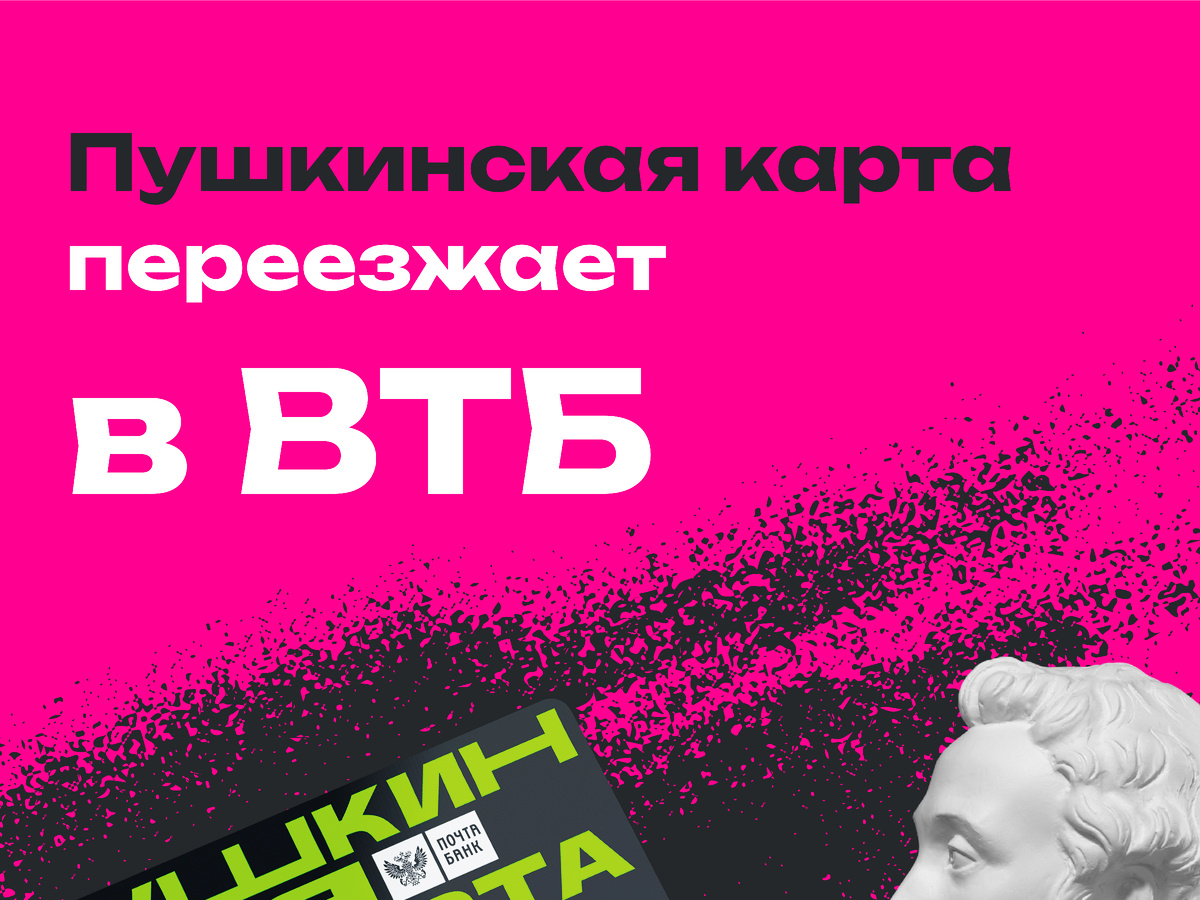 С 1 января 2026 года оператором программы станет ВТБ. Чтобы не потерять возможность посещать культурные мероприятия, доступные в рамках программы, уже сейчас можно подать заявление на выпуск карты в ВТБ: • в мобильном приложении «Госуслуги Культура» • в мобильном приложении или флагманском офисе ВТБ и Почта Банка Карта Почта Банка будет действовать до 15:00 мск 31 декабря 2025 года, а с 15:00 мск 1 января 2026 года автоматически выпустится в ВТБ, если вы подали заявление. Подробнее на сайте