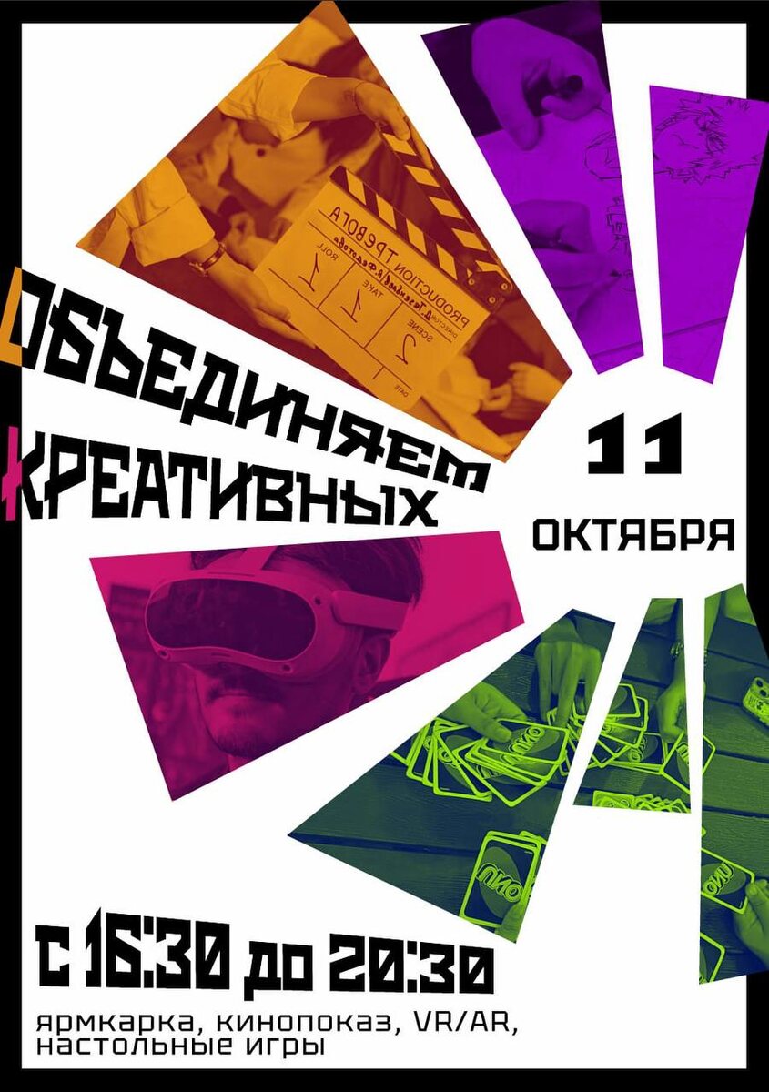 ВСЕМ! ВСЕМ! ВСЕМ! 🎉 Первокурсники, старшекурсники и все-все творческие люди! Готовы раскрасить свои будни и найти команду мечты? 🎨 Тогда вам к нам на грандиозное событие осени — «ОБЪЕДИНЯЕМ КРЕАТИВНЫХ»! Это ваш главный шанс вырваться из рутины, познакомиться с крутыми ребятами со всех направлений и провести незабываемый вечер. Скучно не будет — мы заготовили целых 4 активности на любой вкус! 🃏 ВЕЧЕР НАСТОЛЬНЫХ ИГР От классической "Мафии" до современных стратегий. Проверь свою логику, хитрость и умение блефовать! 🛍️ ЯРМАРКА АКТИВНОСТЕЙ Узнай всё о студенческих клубах,секциях и объединениях нашего института. 🥽 VR-ТУР ДЛЯ ВАС Погрузись в виртуальную реальность с командой прикладных информатиков! 🎬 КИНОПОКАЗ В НАШЕМ ИНСТИТУТЕ А какой фильм мы будем смотреть?Решаешь ТЫ! Мы отобрали 5 крутых варианта, а ты голосуешь за победителя. ➡️ ПРОГОЛОСУЙ ЗА ФИЛЬМ ПРЯМО СЕЙЧАС![https://forms.yandex.ru/u/68e7959090fa7b001ee30ab7] ЖДЁМ ТЕБЯ: 🗓 КОГДА:в субботу 11 октября ⏰ ВО СКОЛЬКО:16:30 ?