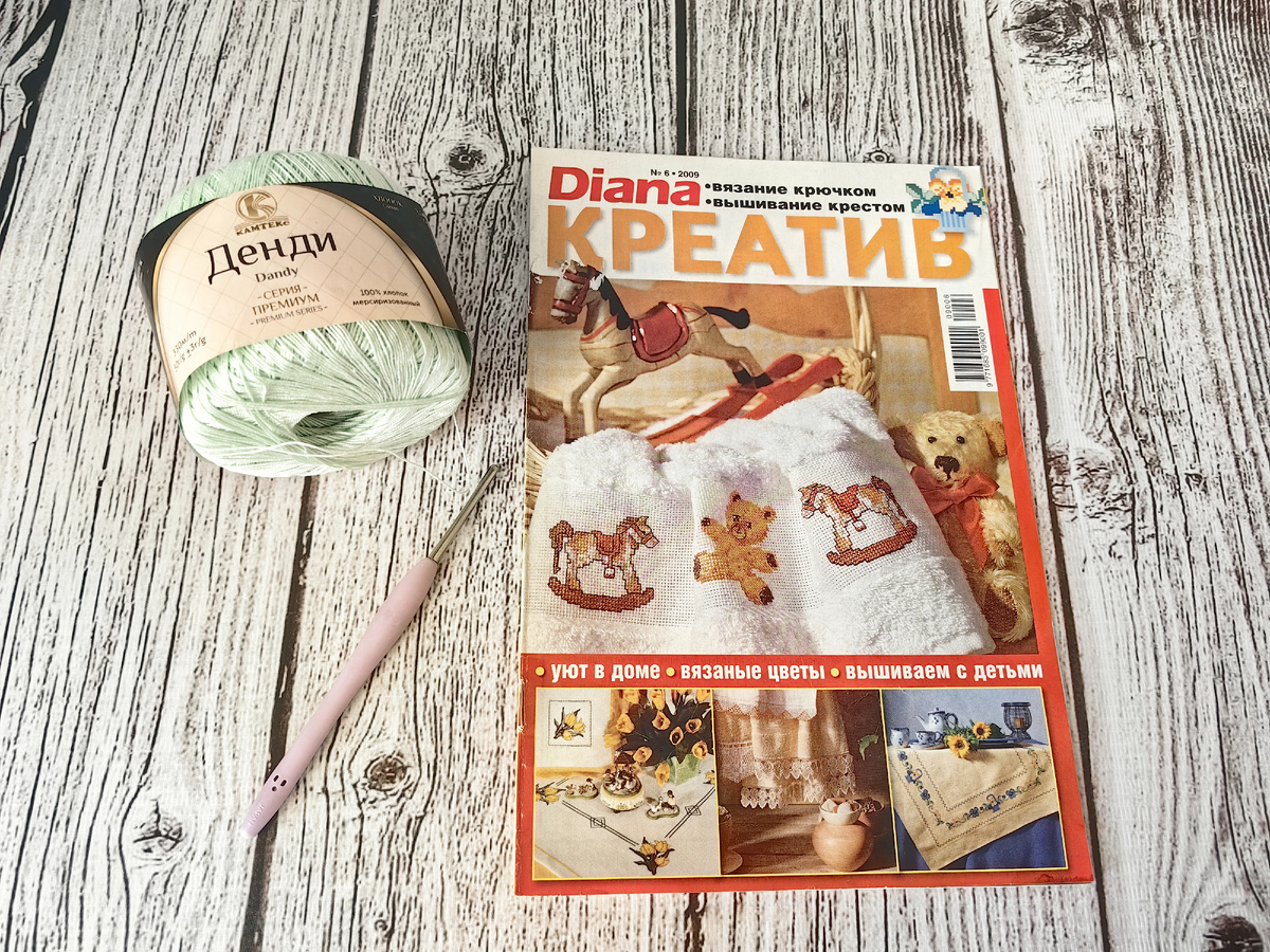 Здравствуйте, дорогие мои читатели. Вот я снова с вами и в этот раз с новой вязаной салфеточкой. Пряжа "Денди", которую я использовала для вязания овальной салфетки "Нежная мята", у меня осталась в наличии, хотелось её использовать ещё при вязании какой-нибудь салфеточки. Поискала я в своих запасах журналов (а их у меня довольно много, любила раньше покупать) какую-нибудь схему небольшой салфетки. Выбор пал на небольшой журнальчик "Диана-Креатив" №6 аж за 2009 год. Салфетку, которая мне понравилась, надо было вязать из более толстой пряжи, ну а я взяла пряжу "Денди", это 100-процентный мерсеризированный хлопок, только цвет 107 (ментол), в 50 гр. пряжи 330 метров. Крючок опять же мой любимый размер №1. Схема для вязания салфеточки небольшая, несложная, хотя и тут были нюансы Насколько я знаю, иногда вызывает затруднения вязание столбиков на ножках, поэтому я сняла маленькое видео, где показываю, как я вяжу такие столбики Салфетка получилась небольшая совсем, вес её всего 12 г