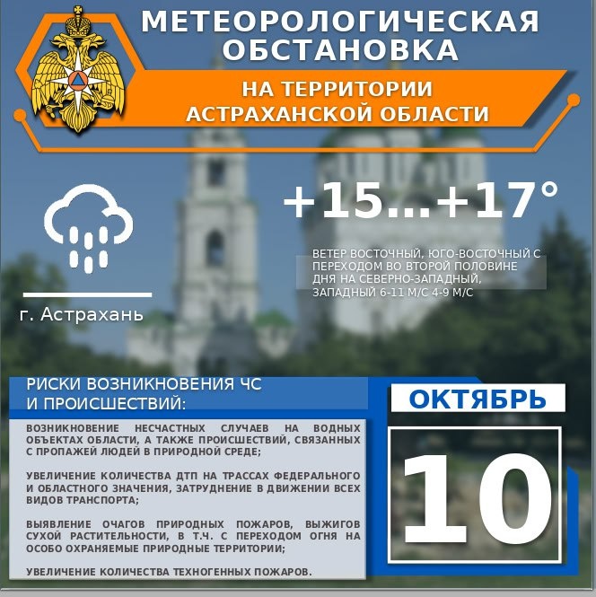 🍂Метеорологическая обстановка на 10 октября 🌡На территории области облачно с прояснениями. Небольшие и умеренные дожди. 🌦Ветер восточный, юго-восточный с переходом во второй половине дня на северно-западный, западный 6-11 м/с. Температура воздуха днем +13...+18°, ночью +7...+12° 🌡По г. Астрахань облачно с прояснениями. Дождь. 🌧 Ветер восточный, юго-восточный с переходом во второй половине дня на северно-западный, западный 6-11 м/с. Температура воздуха днем +15...+17°, ночью +10...+12°. ✅Присоединяйся к МЧС Астрахань 👉🏼Подписывайся на МЧС России в Telegram | MAX