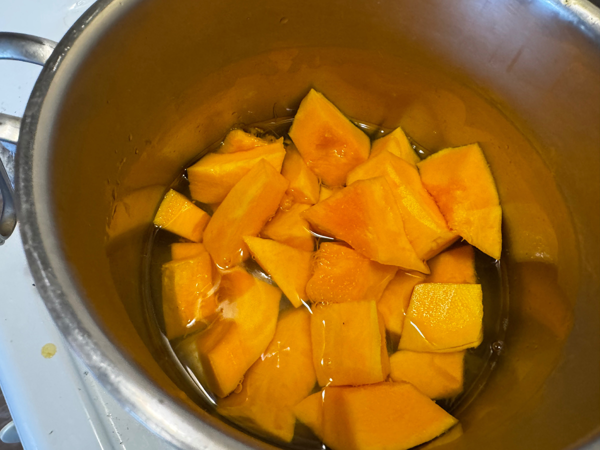 Сначала готовим тыквенное пюре. Просто кусочки тыквы отвариваем и разминаем вилкой. Потребуется примерно 150 грамм тыквы, для получения 100 г пюре. Она немного уваривается.