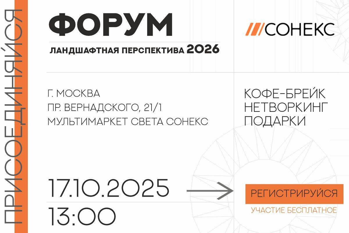 Приглашаем ландшафтных дизайнеров, руководителей компаний и архитекторов на форум «Ландшафтная перспектива 2026». В программе: * секреты освещения высоких деревьев * стратегии продаж бонсая * все о системе автополива * возможности проникающих бетонов * новинки в ландшафтном освещении Вас ждёт кофе-брейк в формате нетворкинга, неформальное общение и подарки. *Офлайн и онлайн.* 17 октября 2025, 13:00 Москва, пр. Вернадского, 21/1, шоу-рум «Сонекс»* Регистрация: https://sonex-2025.timepad.ru/event/3613834/