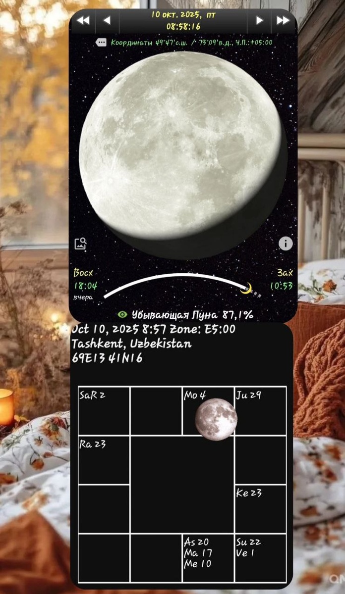 💐🌼🌜10.10.2025.🌛🌼💐 Ведическая Астрология Убывающая Луна в Тельце. РетроСатурн. 🌜🏡☕Луна на цыпочках перебралась в спокойного Тельца, у которого в буфете всегда найдется что-нибудь вкусное😋 Под воздействием Луны в Тельце мы немного расслабляемся, происходит смягчение души и даже😊 может проявиться нежность. 🌜🤩Для повышения настроения и поддержания его в тонусе, рекомендуется сделать что-нибудь приятное друг другу. Угостить яблочным пирогом, сходить в кино или театр. Луна в Тельце под покровительством Венеры, пятница-день Венеры. Достаньте из шкафа все самые красивые вещи, серёжки красивые наденьте, туфельки, сапожки. Локоны, парфюм❤️ да, у вас уже, при виде себя настроение поднимется. Сегодня будете необыкновенно красивы🤗❤️а для того, начинайте уже сутра изнутри излучать чувство красоты, чувство наслаждения этим миром, природа сейчас этому хорошо подыгрывает, разукрашивая все вокруг Цитата на сегодня из к/ф Ешь, молись, люби: Учитесь выбирать свои мысли, как выбираете в