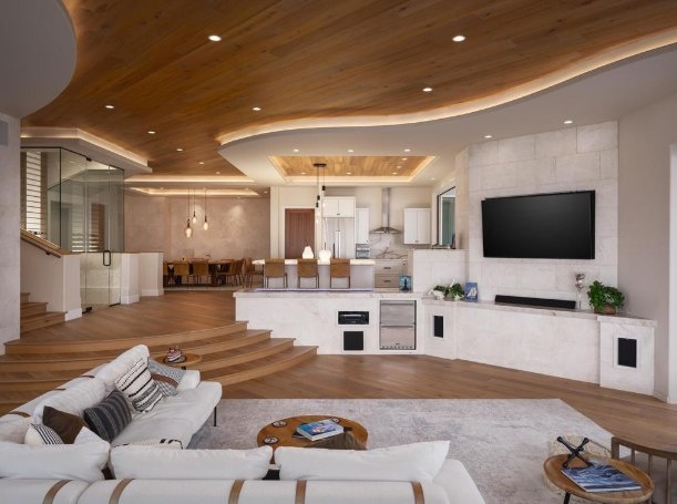 ### Гостиная: Уют на разных уровнях 🛋️ Просторная гостиная открытой планировки выполнена в стиле контемпорари с элементами экостиля. Что цепляет взгляд: 🔹 "Утопленная" зона отдыха: Гостиная расположена на более низком уровне, что визуально отделяет ее и создает уютное, приватное пространство. 🔹 Плавные линии: Широкие, закругленные ступени из светлого дерева смягчают геометрию интерьера. 🔹 Натуральные материалы: Теплые оттенки дерева на полу и потолке, стены из светлого кварца и нейтральная палитра создают ощущение роскоши и единения с природой.