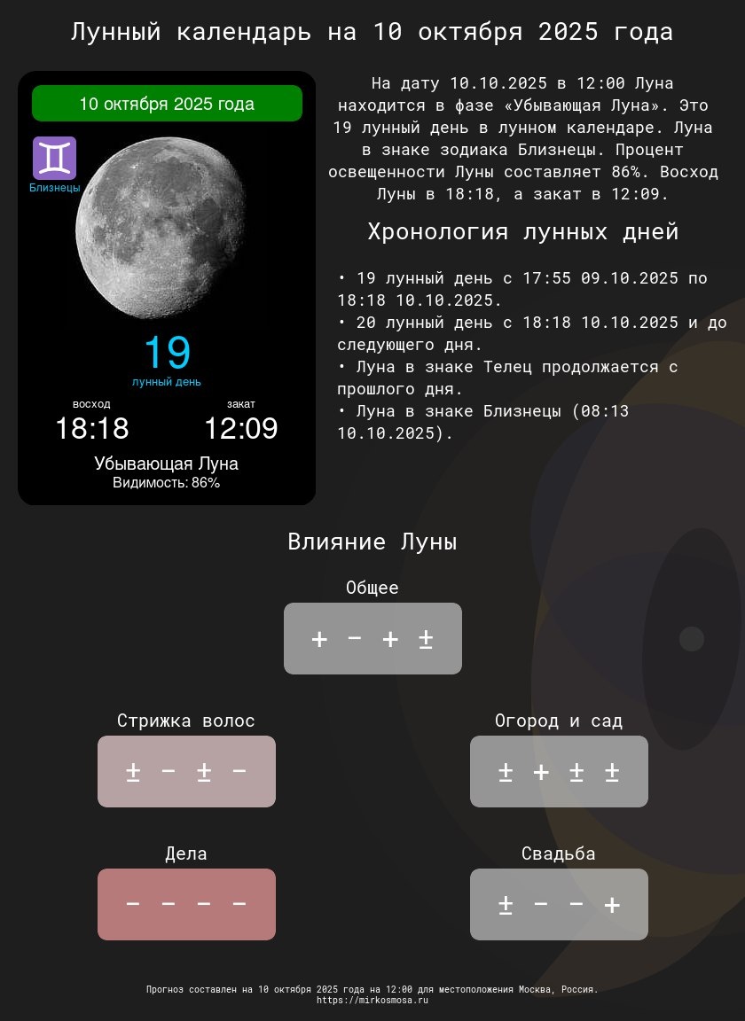 Лунные календари на 10 октября 2025 года: Подготовьтесь к этому дню с учетом влияния Луны! 🔹🌗 Лунный календарь на 10 октября 2025 года — Что приготовила Луна? Подробнее 🔹✂️ Лунный календарь стрижек на 10 октября 2025 года — Подходящий ли день для обновления прически? Подробнее 🔹🌱 Лунный календарь огородника и садовода на 10 октября 2025 года — Лучшее время для ухода за растениями. Подробнее 🔹📅 Лунный календарь дел на 10 октября 2025 года — Удачные моменты для важных задач. Подробнее 🔹💍 Лунный календарь свадеб на 10 октября 2025 года — Подходит ли этот день для вашего торжества? Подробнее