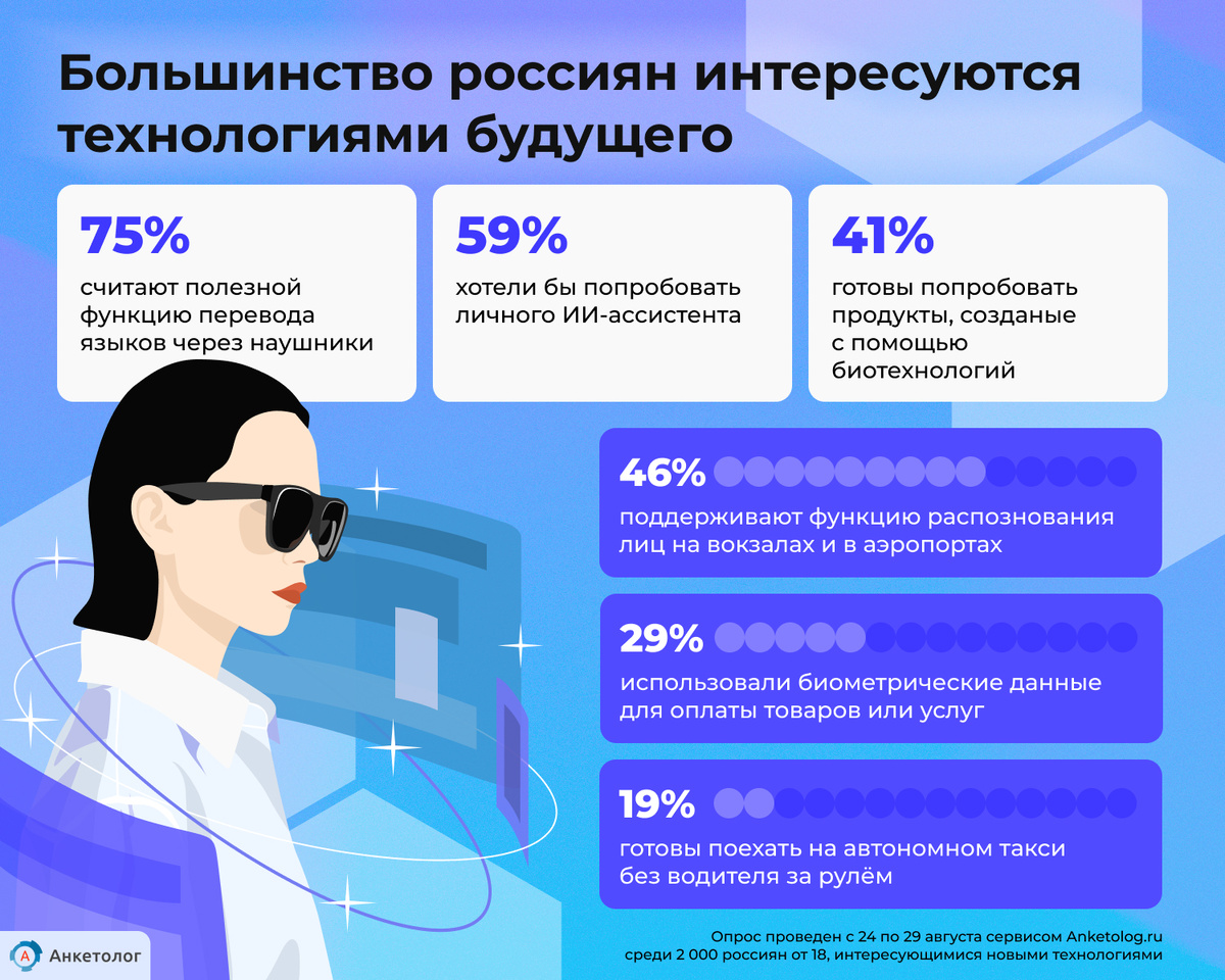 Опрос был проведен с 24 по 29 августа по онлайн-панели Anketolog.ru среди 2 000 россиян от 18, интересующимися новыми технологиями.