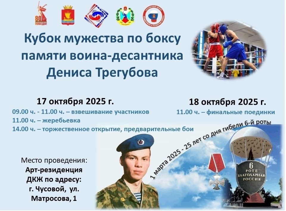 С 17 по 18 октября 2025 года в актовом зале Арт-резиденции ДКЖ (г. Чусовой, ул. Матросова, 1) состоится Кубок мужества по боксу памяти воина-десантника Дениса Трегубова В соревнованиях примут участие около 200 спортсменов из городов Пермского края и Свердловской области. Приглашаем всех желающих поддержать боксёров и посмотреть зрелищные бои. Не пропустите торжественное открытие Кубка 17 октября в 14:00 часов. #спорт@glavachus