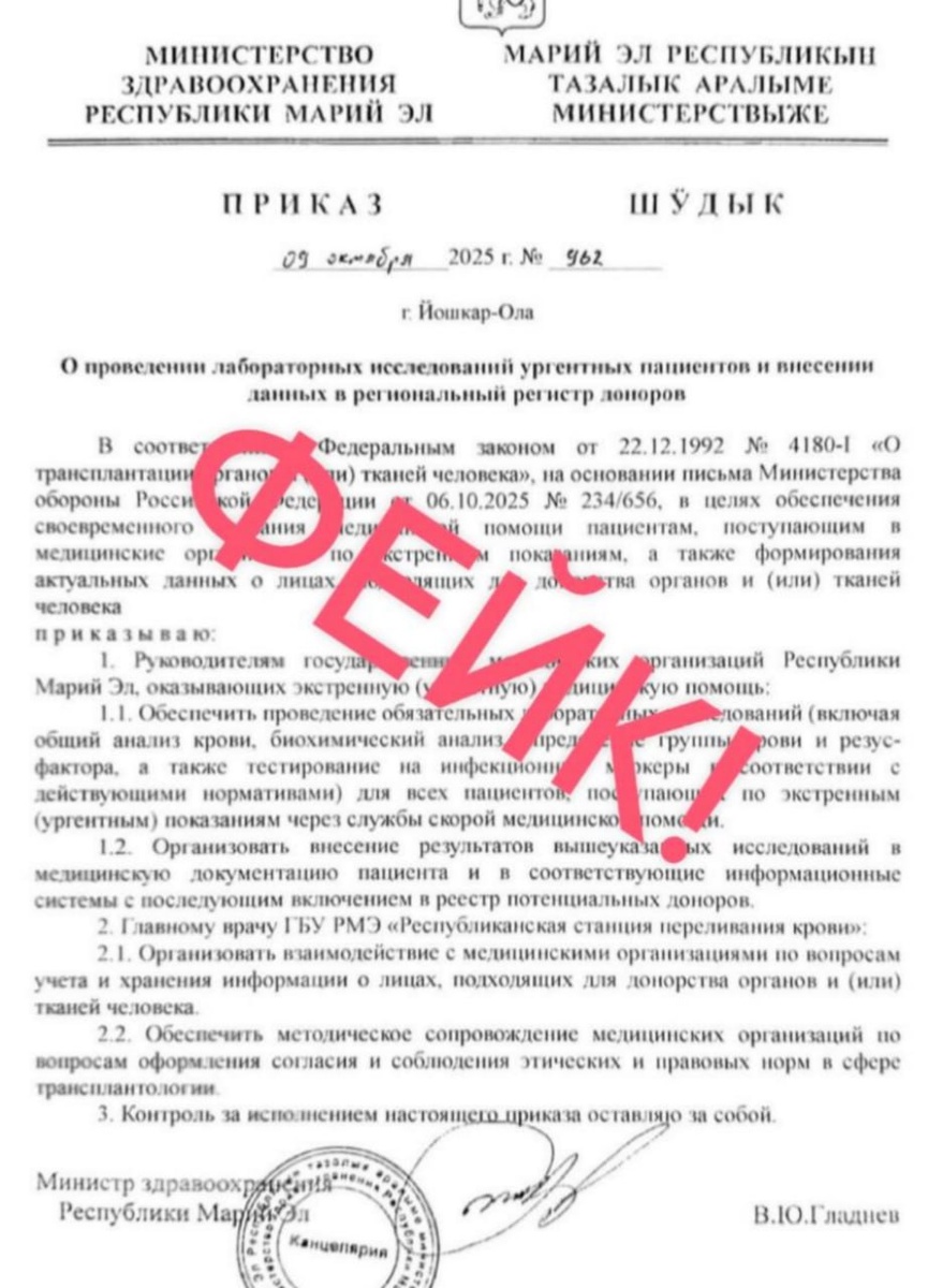 ❗️Минздрав Марий Эл предупредил о новом фейке, связанном с исследованиями крови В министерстве напомнили, что доверять стоит только проверенным официальным источникам. Так, встреченный специалистами в сетях документ приказа Минздрава о проведении лабораторных исследовании экстренных пациентов и внесении их данных в реестр доноров ‒ фейк. В нем говорится, что руководители медицинских организаций должны провести анализы крови экстренных пациентов и включить эти данные в региональный регистр доноров.